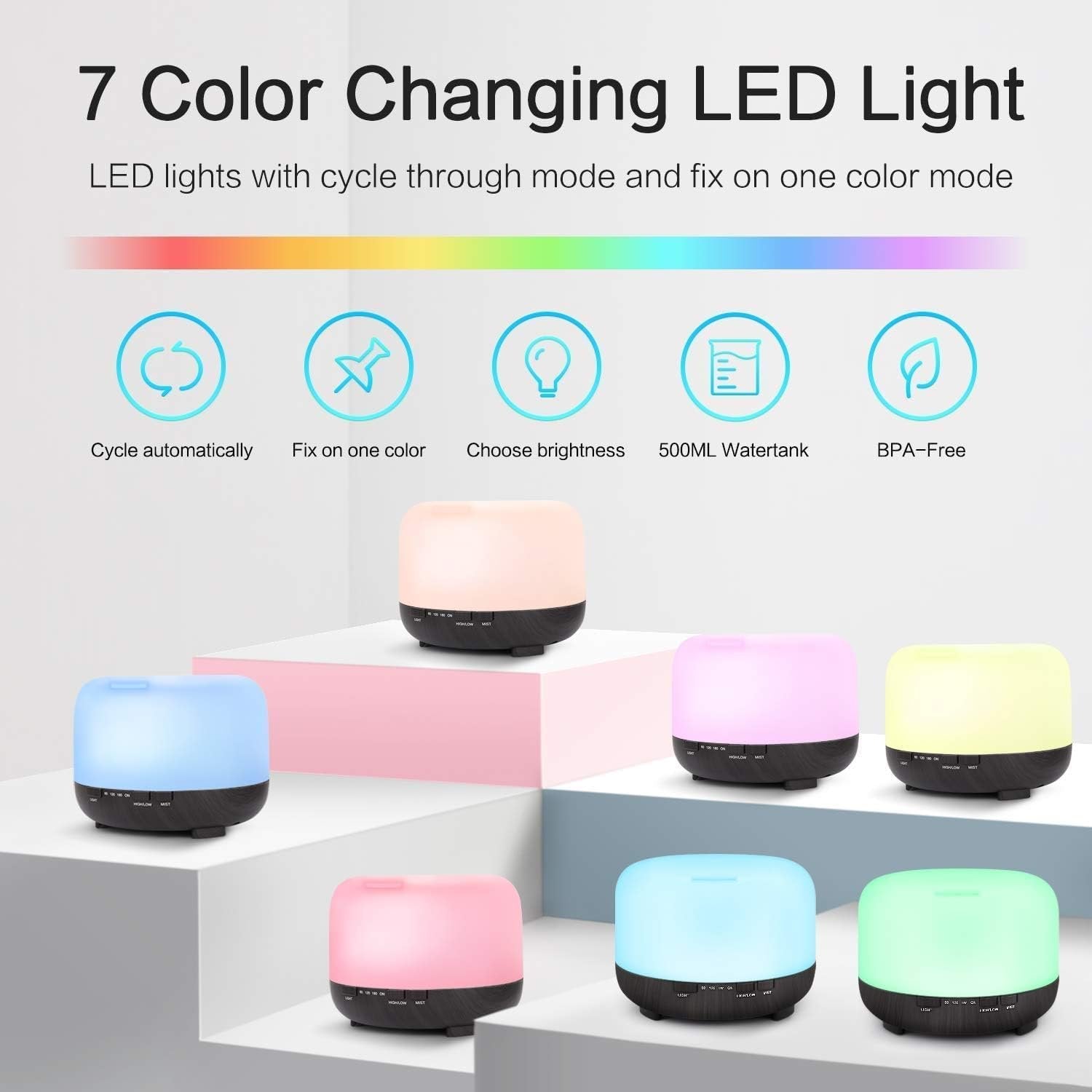 【Not Only is a Humidifier Diffuser But Also a Night Light 】The humidifier for bedroom small has 7 soothing LED light, each color has 2 light options (dim and bright). You can cycle it through 14 colors, or fix it on one color, meeting your different needs. Therefore, the air humidifier not only a aromatherapy diffuser for essential oils but also a perfect decor and night light for your living room or baby‘s bedroom. (you can turn off the lights of the scent diffuser to atomize humidification or just as a night light for illumination.)