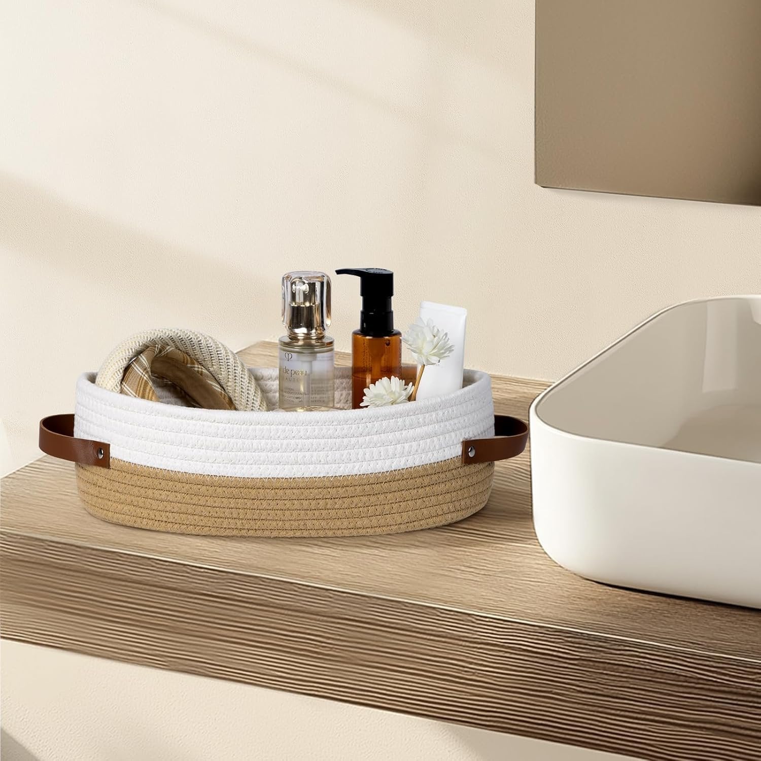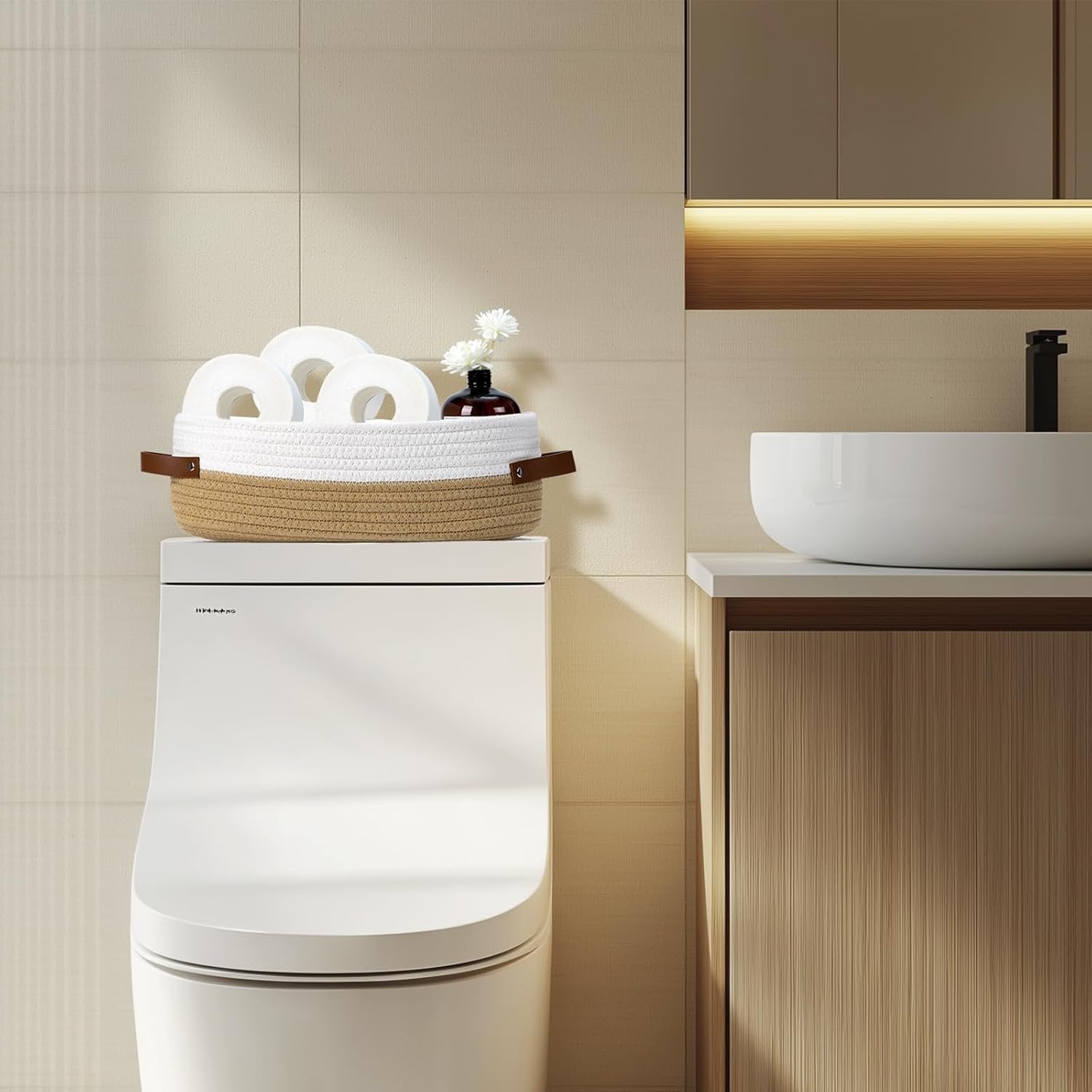 [Soft & Firm] Our organizer baskets are sturdy, soft and comfortable to the touch, one of the choices to use as baby item storage. And the woven storage basket organizer can be folded, so it can be easily stored when not in use, reducing the amount of space it takes up [Rope basket] The soft material and beautiful color match into a minimalist home storage baskets. You can easily place these chic decorative rope baskets in various corners of your home to keep the space away from clutter. A good choice for family and friends [Basket Size] This cotton rope storage basket (13"x5.9"x4") fits on your toilet tank or cabinet countertop, holding 2-3 rolls or bathroom essentials, keeping your bathroom neat and beautifully styled [Thoughtful Design] A beautiful combination of beauty and convenience, the shelf baskets left and right handles are designed to make it easier for you to move the large basket to meet your long-term storage needs. NOTE: A gentle press with an iron will restore the three-dimensional condition [Rectangle Decorative Basket] The simple beauty of the organization baskets can be matched with different home decors to make your living space a well-organized and cozy little home.Our small woven basket set designed to hold toilet paper, personal care in the bath, or office essentials, beauty products, hand towels, toiletries, hair supplies, remotes, etc.Woven basket can be used in living room, bedroom, bathroom, nursery, laundry room, office and more