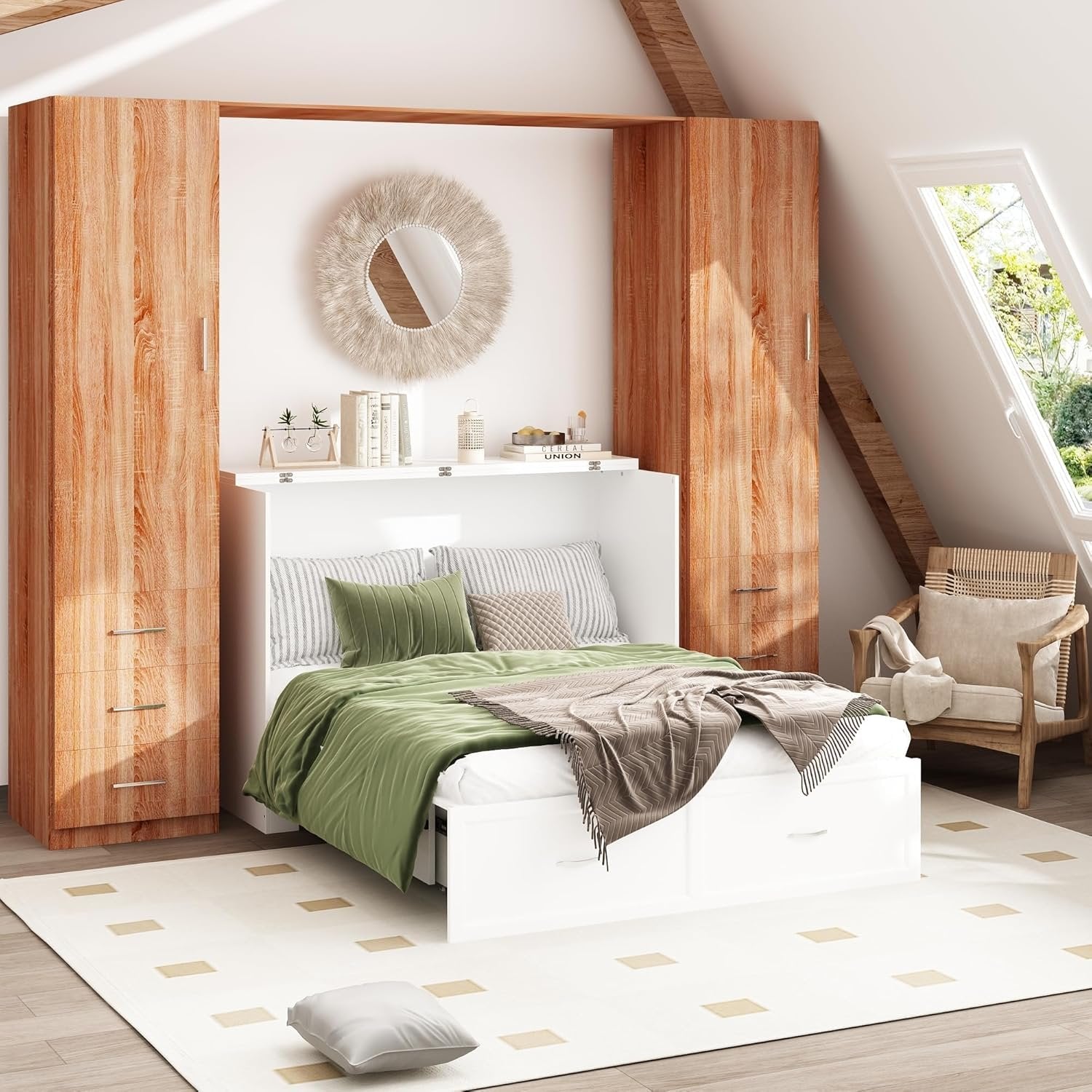 ECACAD Multi-Functional 2-in-1 Murphy Cabinet Bed, Full Size Bed Frame Murphy Bed Chest with Built-in Power Strip & 3 Drawers, Full Foldable Platform Bed, White