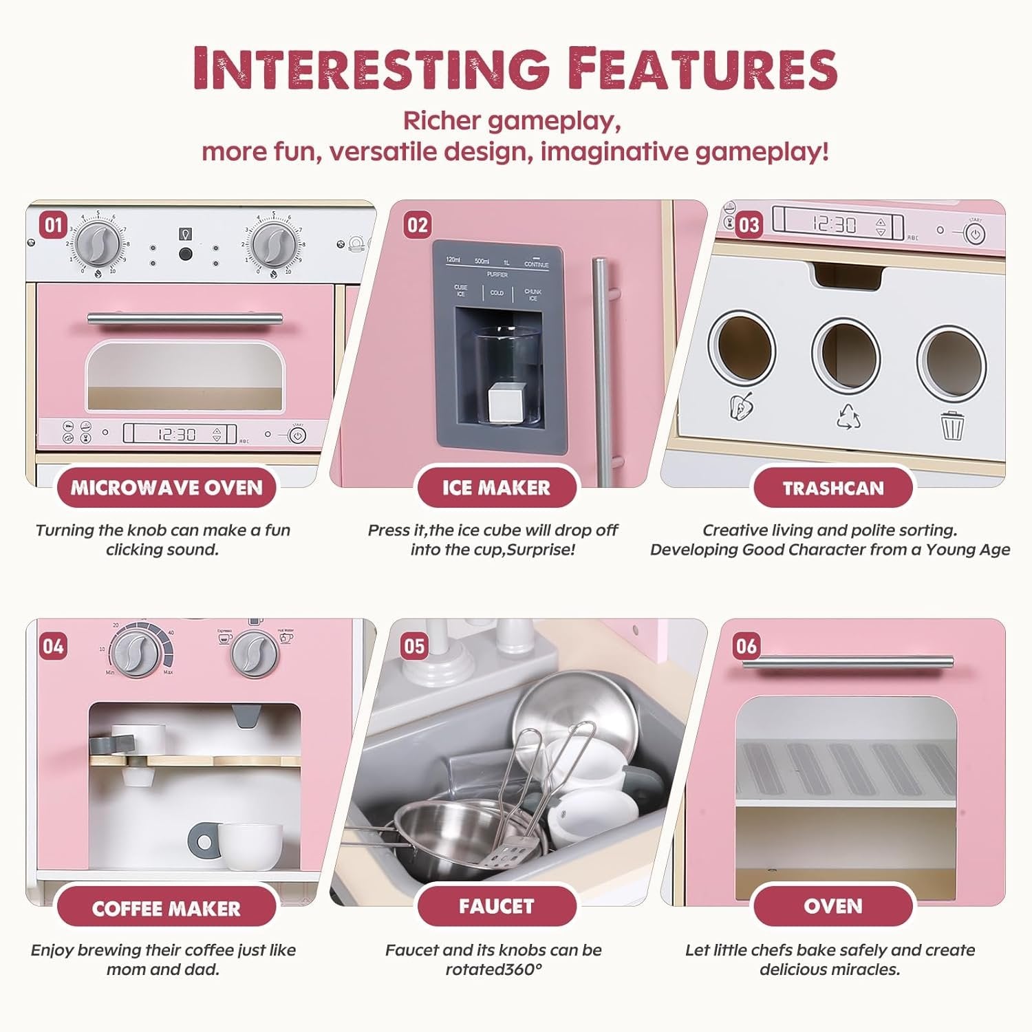 🎄Versatile Cooking Fun: Enter a world of pretend play with our interactive kitchen set designed for kids ages 3-8. Featuring realistic appliances including a cooktop that makes sounds and a realistic ice maker, the set encourages creative role play and helps develop early cooking skills. Interactive features include turning knobs, opening cabinets and an adjustable timer, making it a fully immersive experience! 📌Three Adjustable Toy Heights: The first height is 39.37 inches, which is perfect for babies around 3 years old. The second height is 42.12 inches, which is perfect for toddler aged 4-6 years old. The third maximum height is 45.27 inches, which is perfect for children aged 6-8 years old. Your child no longer has to kneel to play kitchen pretend games! This kitchen toy can grow with your child! 🎁Safety And Durability Guaranteed: Our wooden toy kitchen set is made of high-quality, child-safe materials and meets US ASTM F963 and CPSIA standards, ensuring a safe and durable play experience for your children. Our kitchen toy set adds an anti-tip design to ensure that the product will not tip over, protecting your child's safety at all times! 👩Children's Playground: It is very suitable for several children to get together. Everyone can come here to pretend that they are in a restaurant. They can order food, cook, be waiters, and be customers. In the process of playing, children can enjoy their childhood and learn some useful knowledge. ✨Exciting Gift: This stylish toy kitchen is not only impressive but also of excellent quality. Suitable for both boys and girls, it accompanies their growth, bringing endless joy and precious memories. EDUBEBO toy kitchen is a gift worth cherishing, creating wonderful childhood memories for children.