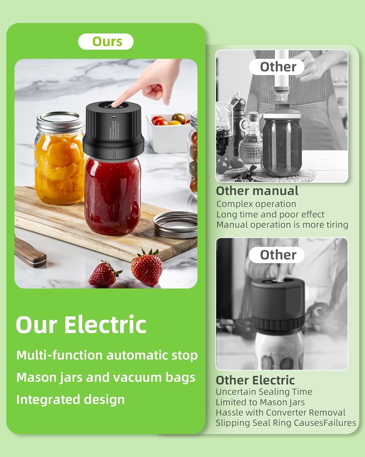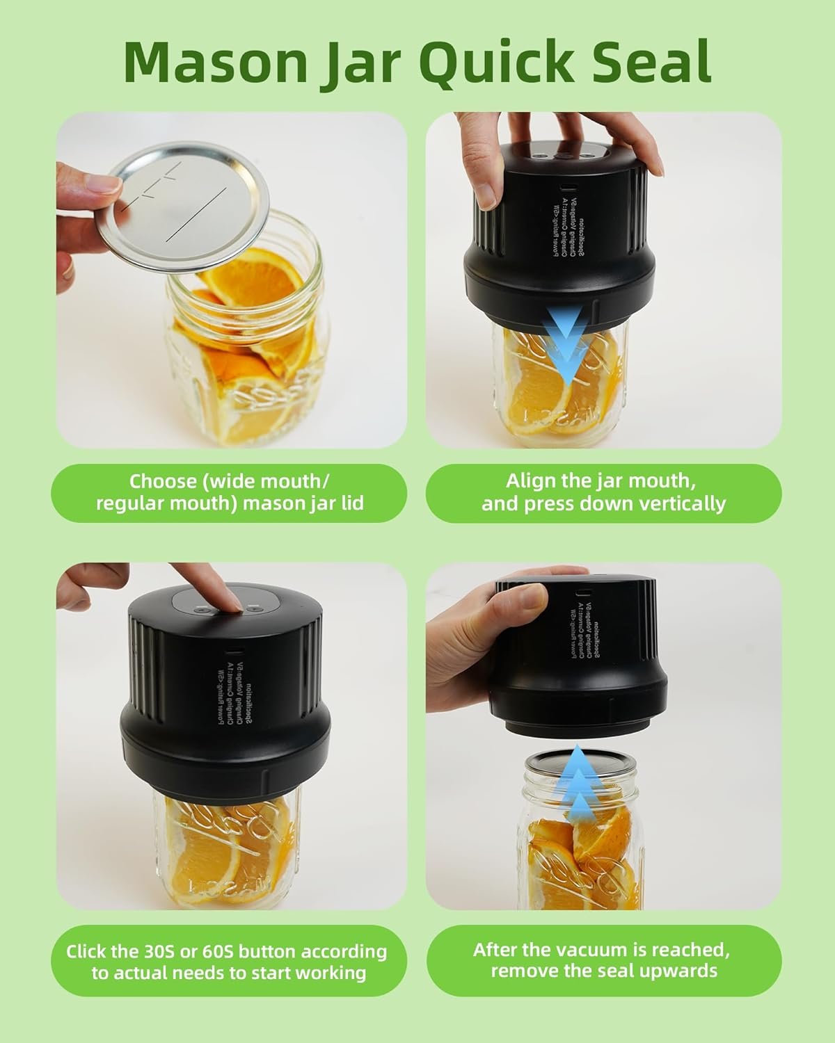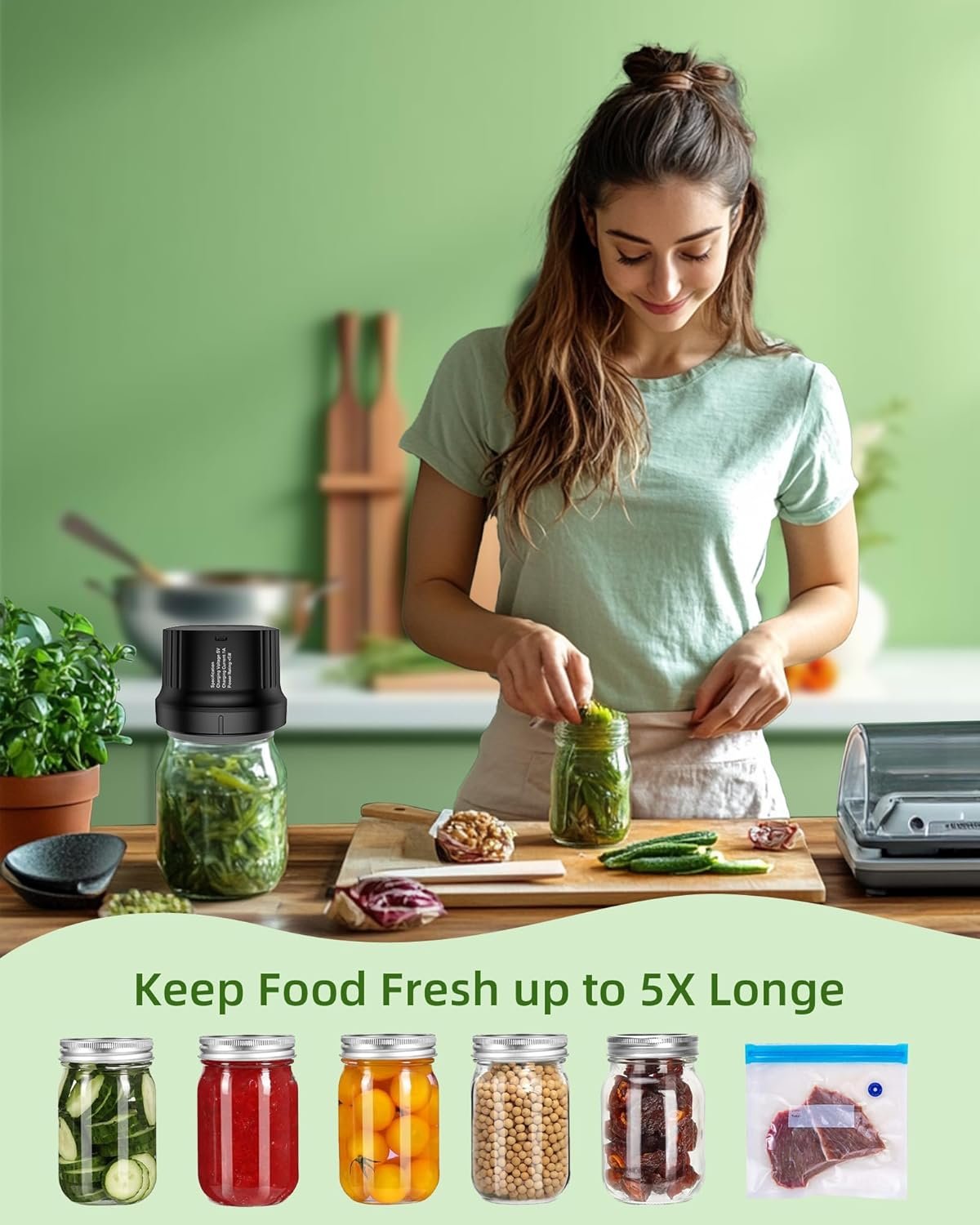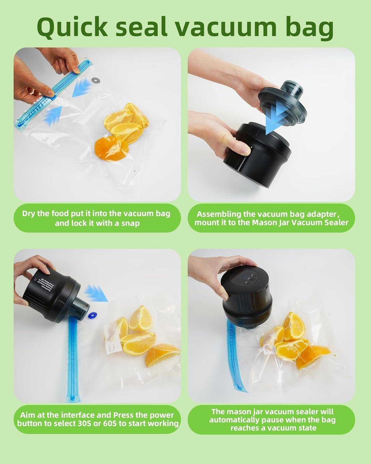 Universal Jar Sealing System Mason Genie is compatible with standard and wide-mouth mason jars. The Gofuch vacuum sealer kit works seamlessly with reusable glass containers and vacuum bags, perfect for preserving spices, locking in freshness, or extending shelf life. Essential for canning supplies, long-term food storage, and the canning process, this tool helps you achieve an airtight seal with ease, whether you need a can sealer machine or a jar vacuum sealer for mason jars. Smart Battery & Operation Monitoring Gofuch vacuum sealer features a 1300mAh battery that delivers 200+ uses per charge with 60Kpa suction. The built-in LED display shows real-time battery levels and working time, 37% more intuitive than standard vacuum sealers. Its ultra-light (0.77lbs) cordless design excels in both kitchen and camping scenarios, making it the ideal vacuum sealer for jars. Travel-Ready Food Preservation System compact 4"x4"x3.5" body fits easily into kitchen drawers or backpacks. Perfect for preserving herbs in spice jars during road trips, sealing camp meals in vacuum bags, or securing mason jar lids for farmers' market hauls. This can sealer machine is your go-to tool for convenient food storage on the go. 3-in-1 Mason Jar Vacuum Sealer Kit kit includes 5 wide-mouth and 5 regular-mouth mason jar lids, 3 reusable vacuum bags, 2 zipper clips, a bottle opener, and a Type-C charging cable. If you encounter any issues, contact us and we’ll respond within 24 hours. This kit is your complete solution for preserving food with mason jar vacuum sealer technology.