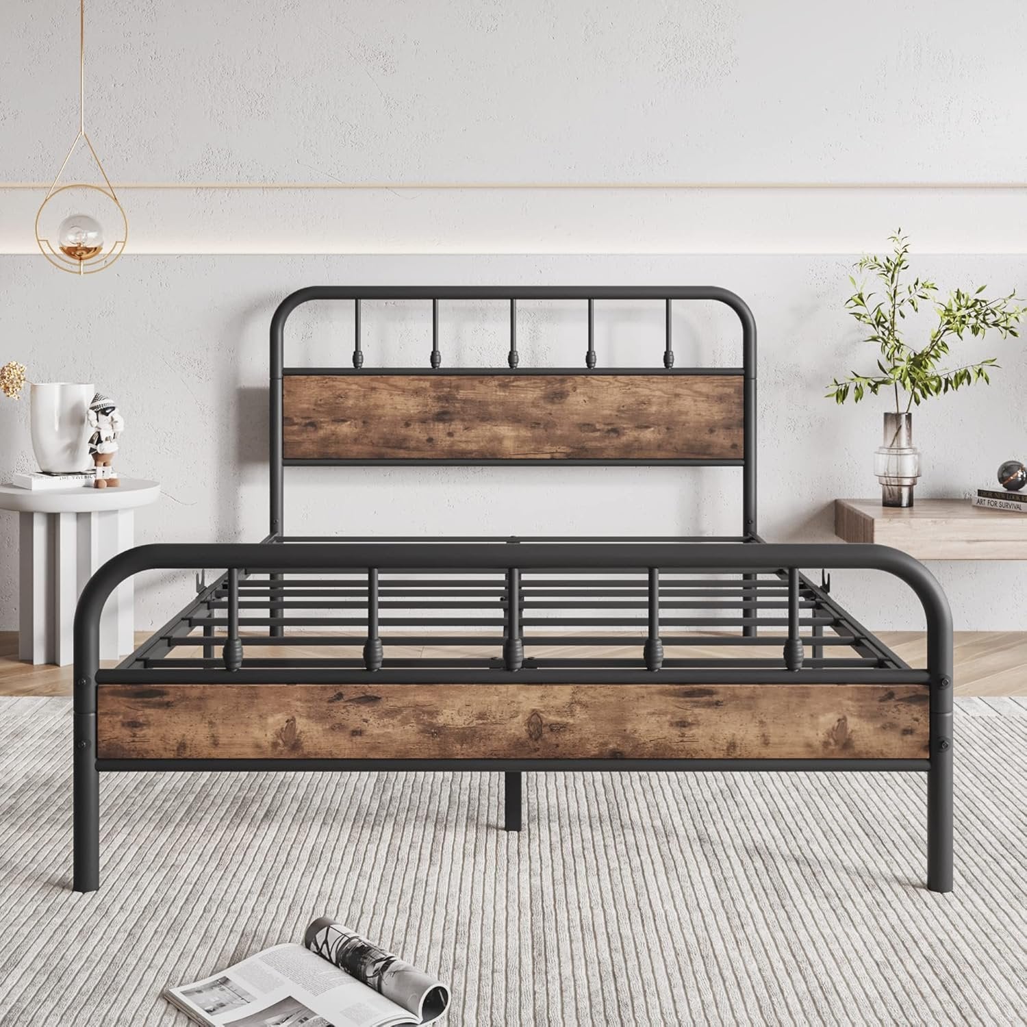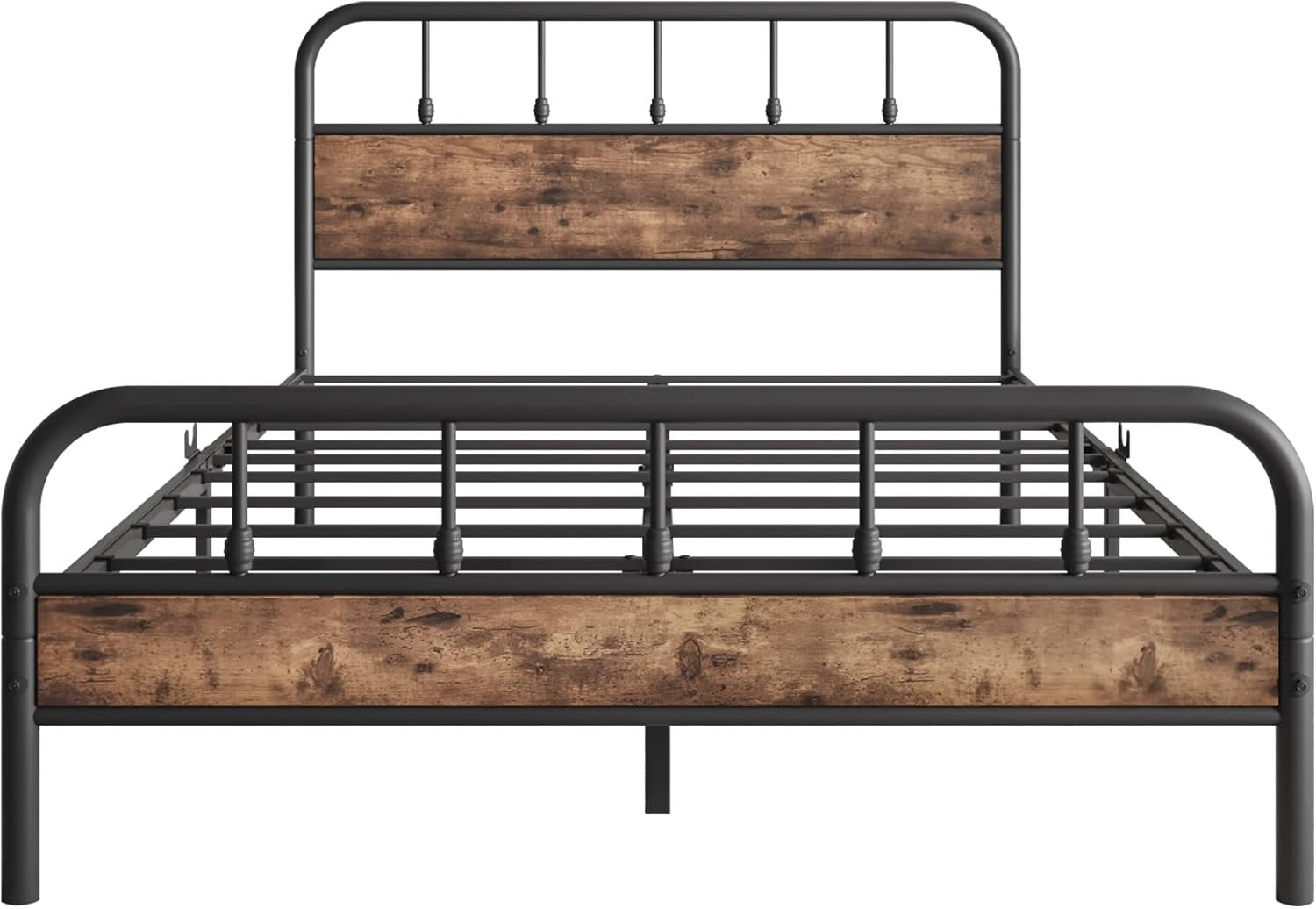 Elegant Home Products Full Bed Frame with Wood Headboard and Footboard,Sturdy Steel Slats,Metal Platform Bed Frame,No Box Spring Needed,Noise Free Mattress Foundation Black & Rustic Brown