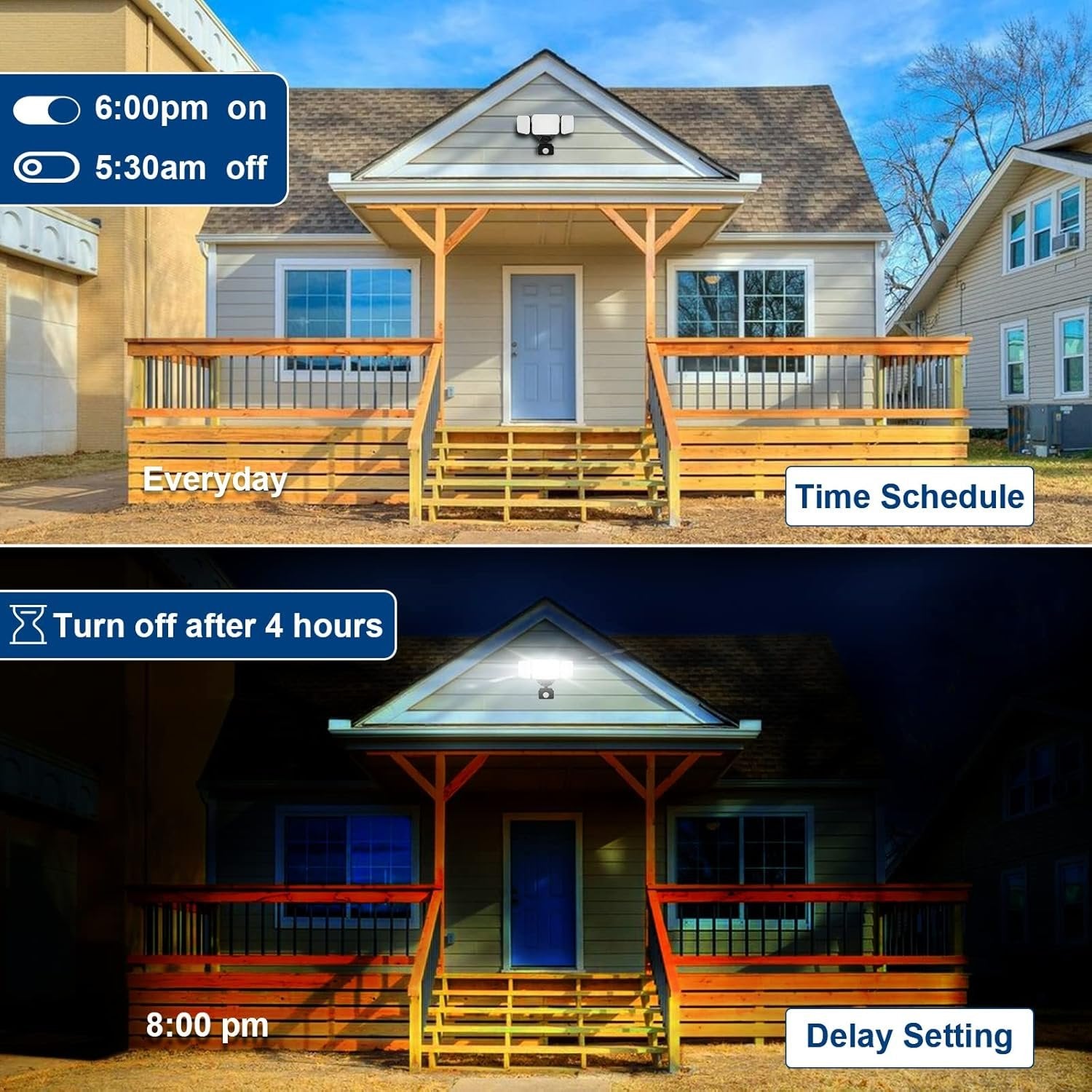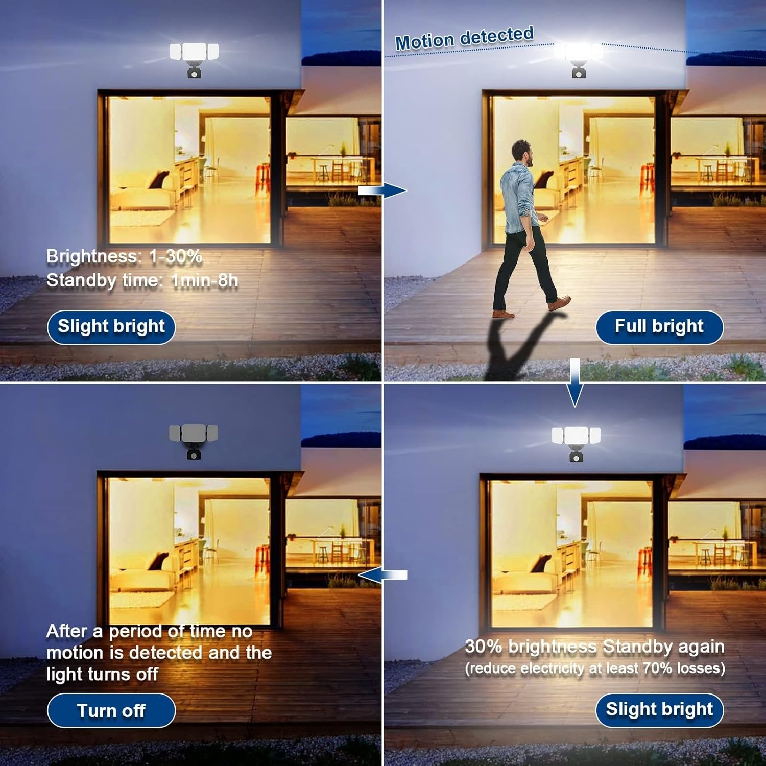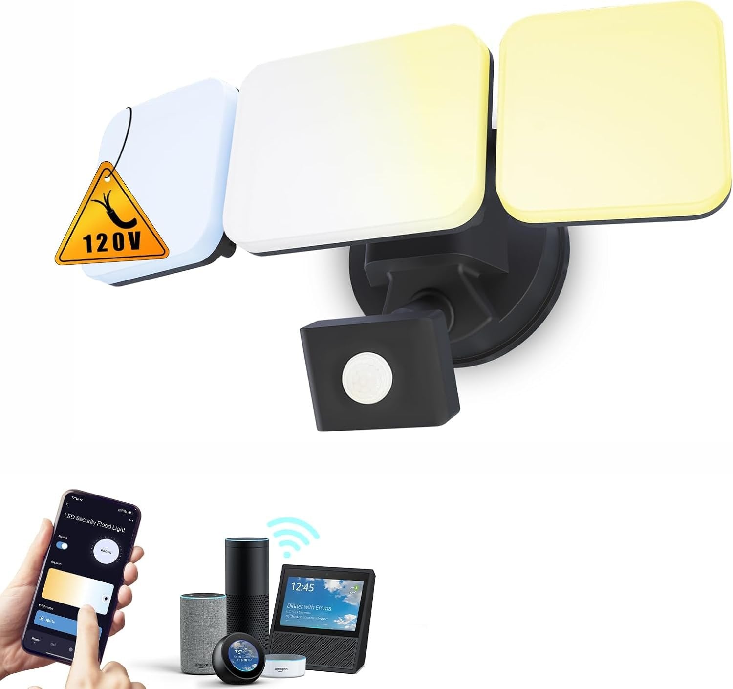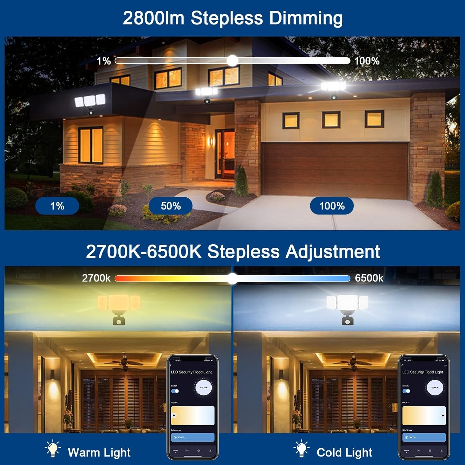 🔰 『 APP Remote Control Smart Flood Light 』 -- The floodlight is connected to "Smart Life" and "Tu Ya Smart" APP via 2.4Ghz WIFI, controlled by cellphone. You can easily adjust all settings (dimmable bright, warm/daylight/cool white, sensing distance, full light duration, etc.) to customize your own security model on the APP. Compared with the conventional security light, this smart security light avoid repeatedly climbing ladder to adjust the settings! 🔰 『 Tunable White and Dimmable』-- 2700K-6500K color temperature stepless adjustable: Warm white + Daylight white + Cool white. And you can adjust the brightness via APP too, the brightness adjustment range is 1% to 100%, you can set the most suitable light to achieve a wide range of flexible lighting.. (With memory function) 🔰 『 Support Voice Control』-- This selectable CCT motion flood light works with Amazon Alexa (Echo/Dot/Tap) and Google Assistant. Remote control this flood lights in office or on your traveling. you can use a simple voice command such as "alexa, turn on the smart security light" to free your hands. 🔰 『 2 Opitional Modes in APP』-- Two modes in APP: ①Manual mode: use as a normal light, will stay on non motion sensor, this flood light can be set turn on or off at a specific time (can adjust brightness and color temperature); ② Sensor Mode: make the sensor work, you can customize sensor settings on APP. 🔰 『Motion Sensor & Adjustable Design』-- Detect ambient motion by PIR sensor and activate lighting while event records can be checked on APP (max 26ft sensing range and 5s-60min adjustable full light duration time). 3-heads and motion dectector head can be adjusted flexibly at any angle you want. 🔰 『Group Control & Linked Devices』-- One mobile phone can control multiple lights and create connections between the lights. For example, when the security light in the garage is on, the porch one will automatically light up. In addition, after completes the device pairing, you can share the paired devices with your family members.