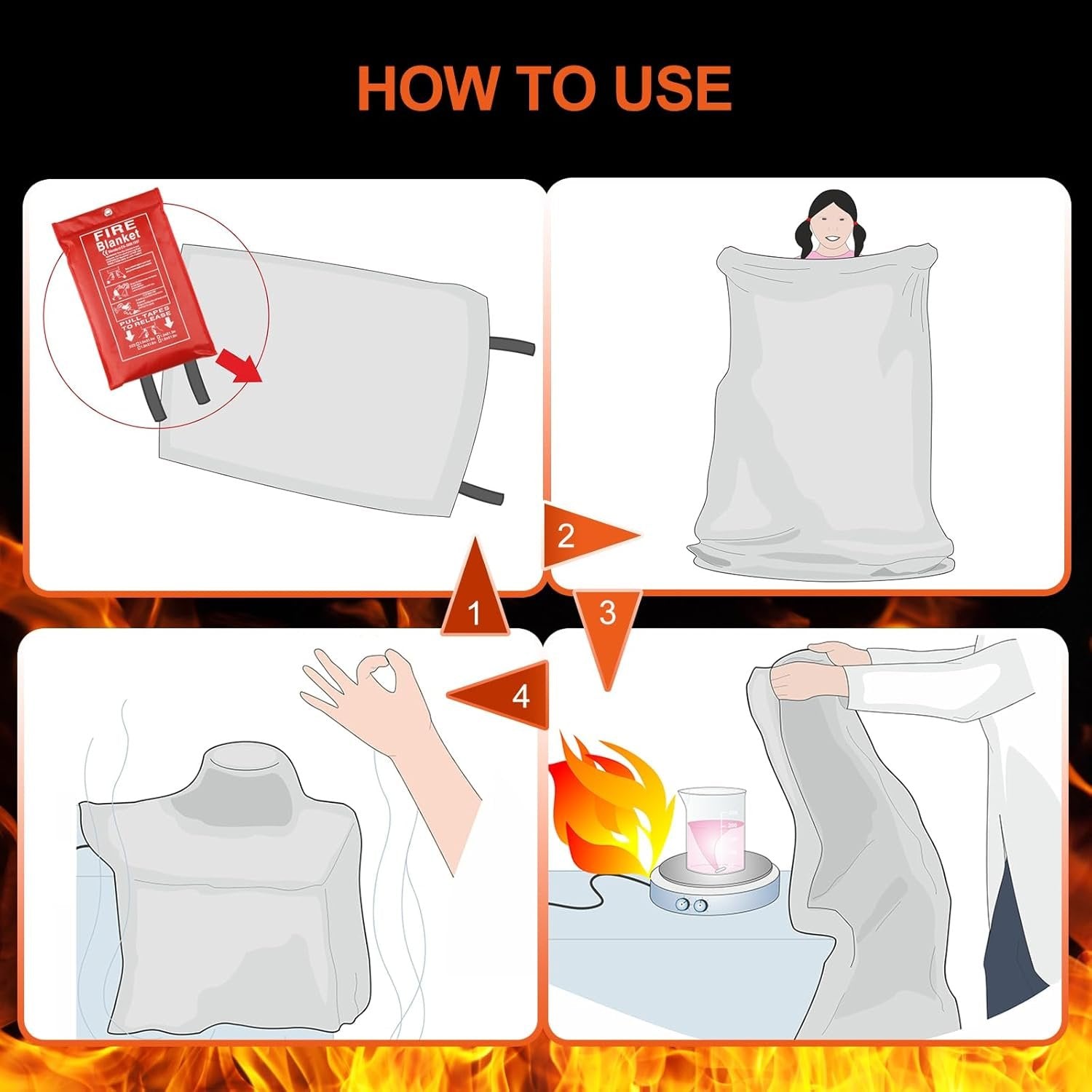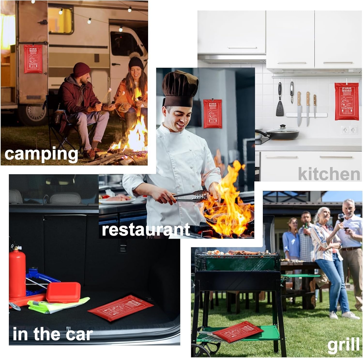 EMERGENCY FIRE BLANKET IS Made from 100% quality flame retardant material. Composed of two layers of woven fiberglass fabric and an inner layer of fire retardant film. They can isolate high temperatures up to 1076°F (580℃). EASY TO USE: Pull down the fire blanket, slowly cover the fire (don’t pull back it right away), turn off the heat source, throw away it after the temperature is down. Can be used simply without training. EASY TO STORE: It has a hole slot so it can be easily hung on walls. Keep the Fire Blanket in the kitchen, fireplace, grill, car, office or take it camping. A must have in your kitchen, backyard and vehicle survival kit for protection. LIGHTWEIGHT FIRE SUPPRESSION BLANKET: Whether grease fire or camp fire, be prepared indoors and outdoors alike. They can also be used as a thermal or heat shield. Extinguish small fires quickly and easily with no mess (unlike common fire extinguishers). Simply deploy the blanket by pulling down the tabs. Unlike traditional extinguishers, the fire blanket never expires. It doesn't need to be replaced.