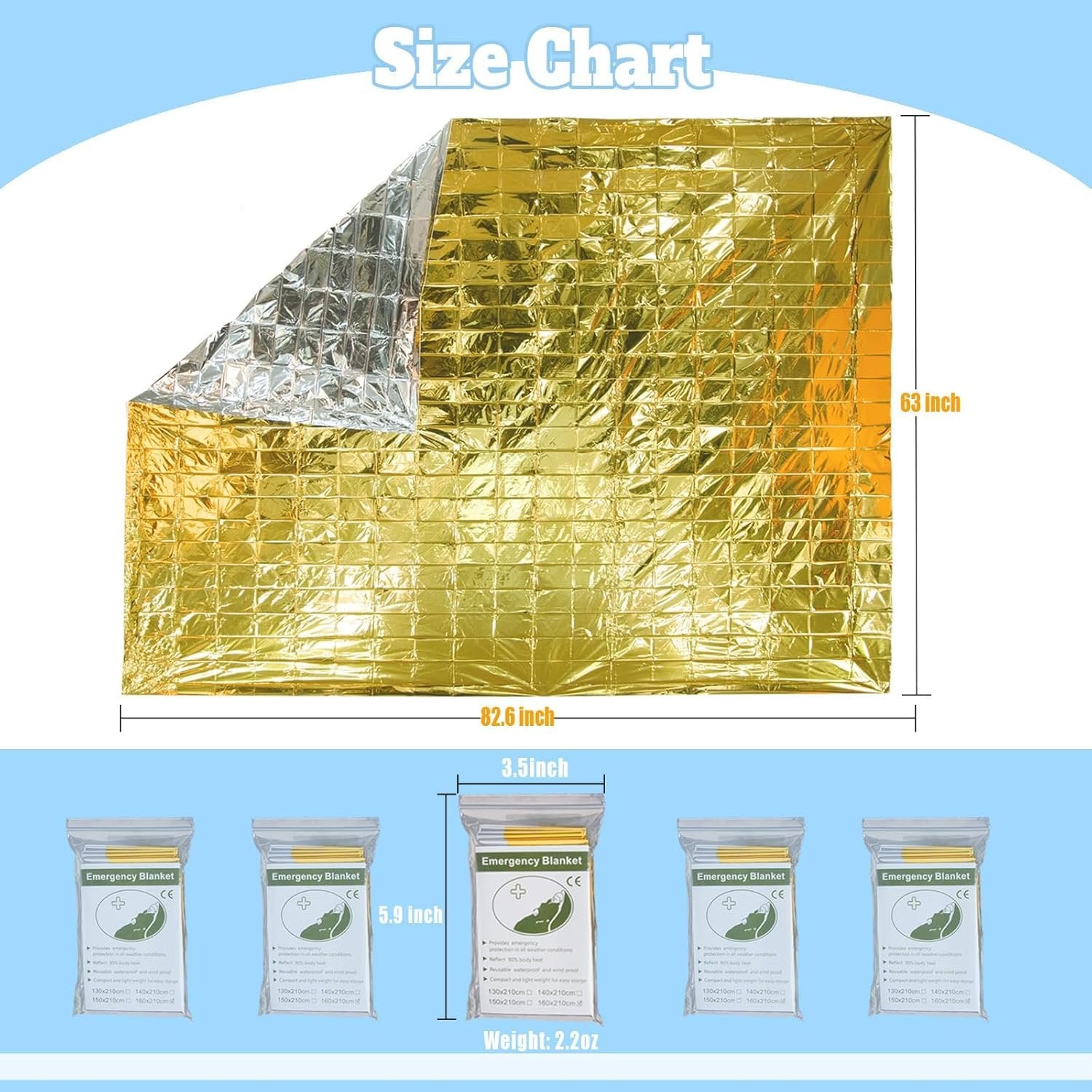 PREMIUM MATERIAL: Our blankets use advanced aluminum mylar material, and the outer layer of aluminum foil can maintain 90% of the body's heat, effectively preventing hypothermia, making it the best choice for storing body temperature in emergency situations; The durability and reliability of mylar materials make them reusable FIVE-PACK CONVENIENCE: Each Emergency blanket in our set is individually folded and sealed for easy storage and retrieval. The size of the emergency blanket is 63 '' x 82.6 '', we offer a larger width than the standard emergency blanket, ensuring full coverage for adults. Weighing only 2.2oz, they fit effortlessly into your travel backpack or pocket VERSATILE EMERGENCY USES: Our emergency blankets can provide maximum protection under various conditions, they can be used as simple tents, shelters, shade, rescue signals, bed sheets, arm sling bag, sleeping bags, dust covers, floor coverings, or other creative uses; They are essential items for camping, hiking, marathons, tactical equipment preparation, and travel first aid kits. They are also auto emergency kits, when vehicles break down in cold areas or at night, emergency blankets can keep the body warm UPGRADED MULTI-FUNCTIONALITY: Featuring a silver side and a gold side. The reflective gold surface enhances visibility for rescue personnel, ensuring you can be spotted in critical situations, especially in the snow REFLECTED SUNLIGHT & RAINPROOF MATERIAL: Mylar blanket can deflect heat from the sun, avoid direct sunlight and sunburn. It is suitable for emergency protection in harsh weather conditions, helping to block rain, snow, and wind, allowing you to stay dry and warm in extreme environments