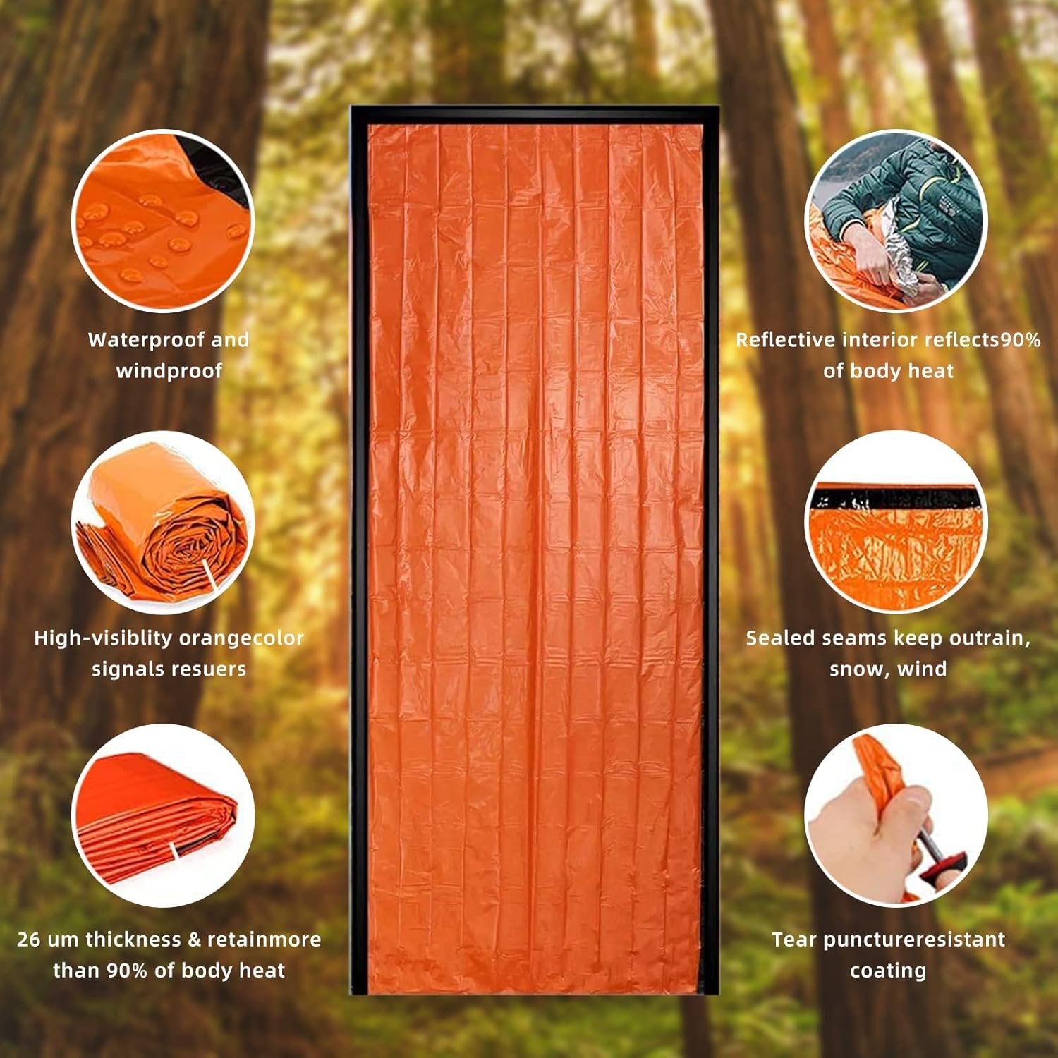 【Emer_gency Sleeping Bag & Survi_val Sleeping Bag】 The survi_val sleeping bag provides heat retention and is insulated in an emer_gency. In the event of a collapse, the refuge can be set up quickly and efficiently. This is an important part of a survival or camping kit to stay warm at a critical moment. 【Ultra Lightweight and Foldable】The emerg_ency sleeping bag is made of aluminized PE film (weight: 120g, thickness: 0.026mm), it is lightweight, waterproof, and easy to carry. The emerg_ency blanket folds into a small size, it can be used almost anywhere stowed away, leaving plenty of room in your backpack for additional gear. 【Use For Signal Rescue】Emerg_ency survi_val blankets, equipped with signal whistles and nylon stuff sack. Sleeping Bag Bright Orange Outside can be used as a signaling device, attracting others' attention, being a nece_ssary survival tool. 【Outdoor Essentials】The emer_gency sleeping bag is not easy to tear, has good waterproof performance, strong wind resistance and strong insulation performance. It protects against cold and heat, saves more than 90% of radiant heat and prevents and resists hypothermia by reducing heat loss from the body. Provide full protection from rain, wind and snow. 【Suitable for Multiple Scenes】Perfect tool to add to the first aid kit, it is essential for outdoor activities, adventure, hiking, and travel, it can be used as an emer_gency rescue blanket, sleeping bag, picnic blanket, an essential pack for climbers, mountaineers and walkers.