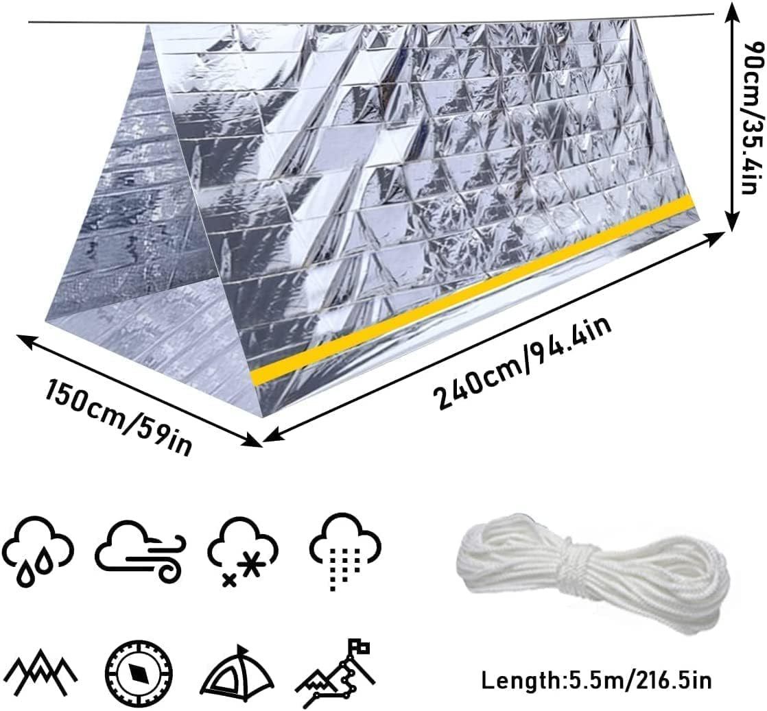 ISOP life saving tent is made from thermal rescue blankets , we also added two mosquito nets for more comfort. SURVIVAL KIT : This survival tent can be used on a regular basis during outdoor activity or mountain climbing and not just in emergencies, as it weighs only 12 ounces and is a complete camping tent for all occasions. GLOW STICK : It has a glow stick, there are stakes for easier set up and a whistle, as well as a set of 3 paracords to stretch the tent. MULTIUSE :The survival set tent is designed for 2 people, protects you from cold, rain, sun and wind. In all conditions, our awning is perfect choice. MULTIPURPOSE SURVIVAL THERMAL BLANKET : Perfect for waterproof, moisture-proof, UV-proof with high low temperature resistance protection. It is very suitable as a outdoor gear for both men and women for such activities as hiking, camping, backpacking and mountaineering. These mylar thermal blankets can be used as ground covering, sleeping bag liner, emergency poncho, tent car blanket camping tarp survival against wind rain cold heat dirt dust...