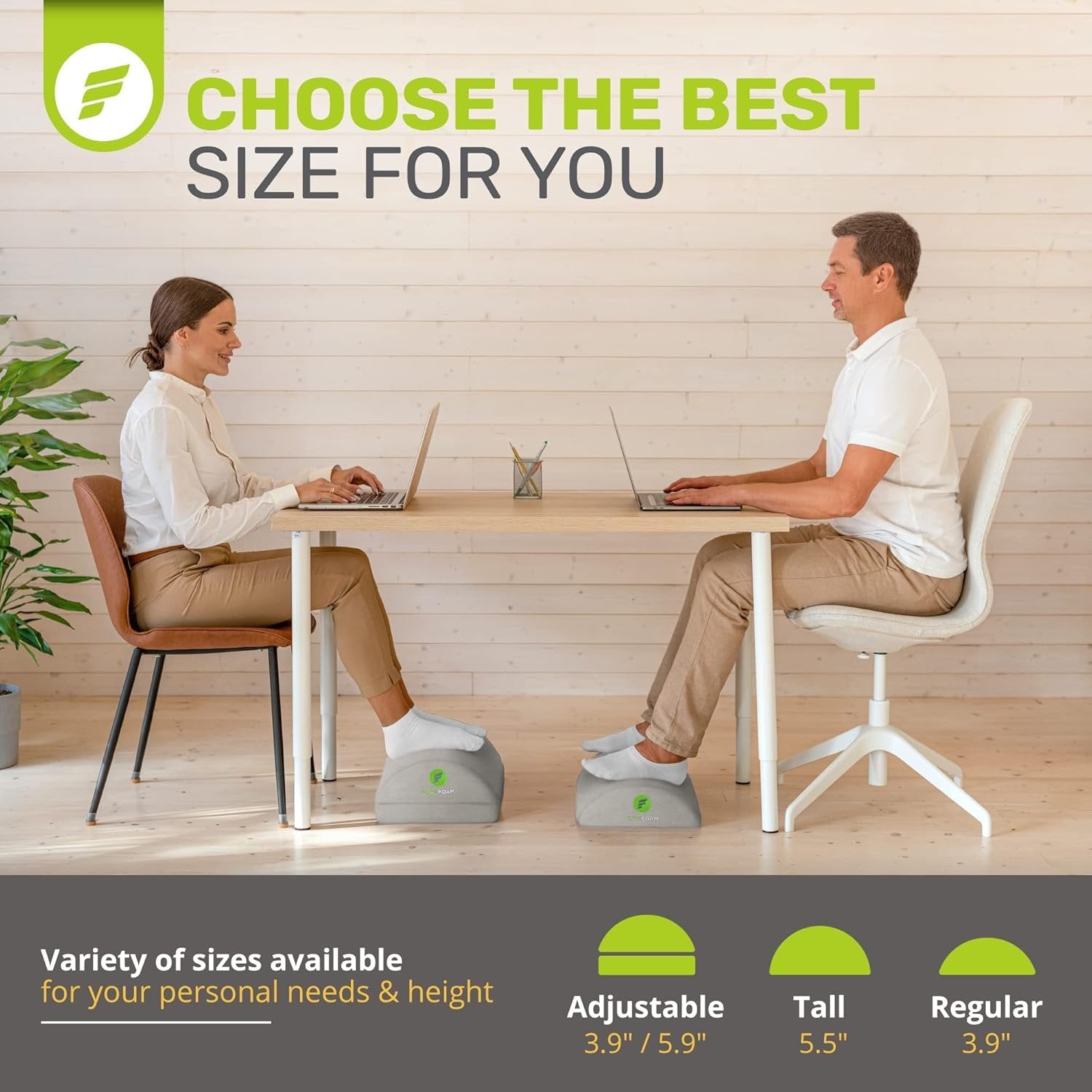 FOR THE BEST SUPPORT POSSIBLE, your under desk foot rest should be CUSTOMIZABLE to your needs – but many foot stools are THE WRONG HEIGHT and AREN’T ADJUSTABLE. Made by the only foot rest brand endorsed by U.S. chiropractors, the ErgoFoam Adjustable Foot Rest ADJUSTS EASILY to the optimum height for your chair & leg length, providing the support you need for LONG-LASTING COMFORT, BETTER POSTURE, and RELIEF FROM LUMBAR, BACK, and LEG PAIN. THE AVERAGE OFFICE FOOT REST is great for the first fifteen minutes, but then starts to FLATTEN OUT due to LOW-QUALITY FOAM that’s too soft and flimsy. Our high-density ErgoFoam was developed to MAINTAIN ITS SHAPE and FIRMNESS over time, RESISTING COMPRESSION under the weight of your legs and feet – and providing better support than memory foam foot rest s. With a DOUBLE-SIDED NONSLIP BOTTOM, this under desk foot stool stays put and won’t slide around on your floor. 2 FOOT RESTS IN 1! Larger and wider than other foot rest stools, our ergonomic foot rest under desk design features an ARCHED STRUCTURE for COMFY SUPPORT throughout the day. WANT TO GET YOUR FEET & LEGS MOVING? Flip over your foot pillow to transform it into a ROCKER FOOT REST for increased circulation and muscle movement. With our foot stool under desk cushion, you’ll notice IMPROVED POSTURE and less back, hip & leg pain. To clean, simply remove its velvet cover and TOSS IT IN THE WASH. OUR PROMISE TO YOU: We developed our adjustable foot rest for under desk to be THE ABSOLUTE BEST FOOT CUSHION on the market, providing UNPARALLELED FOOT SUPPORT, better posture & circulation, and REDUCED PAIN and PRESSURE on the legs, back, and spine. If for any reason you aren’t satisfied with your office foot rest under desk pillow, WE’RE STANDING BY TO HELP make it right – no questions asked. WE MAKE OUR CUSTOMERS OUR VERY TOP PRIORITY. AT ERGOFOAM, OUR GOAL IS TO HELP YOU FEEL YOUR BEST, EVERY DAY. We designed our line of home office accessories and work from home essentials to bring you COMFORT & EASE IN ANY ENVIRONMENT, whether you’re working at your desk or relaxing on the couch. The perfect combination of UNBEATABLE SUPPORT and DURABLE CONSTRUCTION, you’ll want to bring your ergonomic office footrests with you wherever you go.