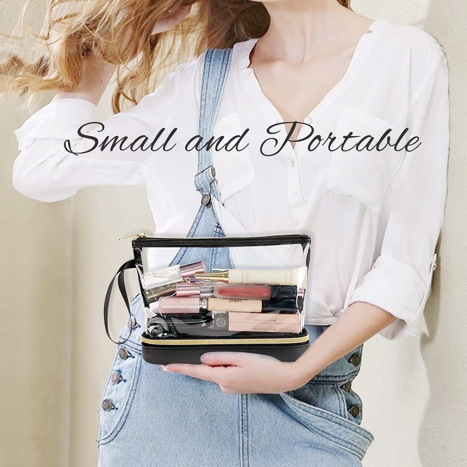 Double-layer Design - The top layer can hold lipstick, eye shadow, loose powder, liquid foundation, bb cream, eyebrow pencil, eyeliner, etc.The lower layer can hold makeup brushes, eyeliner, eyebrow pencil, etc. Separated storage, keep neat! Premium Material - Made of clear TPU and black vegan material, it's lightweight and tough. Great PVC material with certain waterproof performance, and you can quickly reach what you want cosmetic. This small makeup bag uses SBS zipper, more smooth and durable. Convenient and Portable - A practical size makes your travel easier. It can meet your daily makeup needs and short-term travel. Portable handle, carry it freely. Large capacity and won't take up too much space. Occasion - This makeup travel bag serves not only as a cosmetic bag but also as a travel toiletry bag for women. It is suitable for carrying various travel essentials, bringing great convenience to your daily beauty routine. Great Gift - This small makeup pouch is an ideal gift for Christmas, Thanksgiving, New Year, Birthdays, Valentine's Day. It's a wonderful gift for girls/women, mothers, lover, friends, or yourself! Note: When you receive this clear bag with a slight wrinkle in winter, it is a normal phenomenon, and you can use a hair dryer to flatten it with hot air.