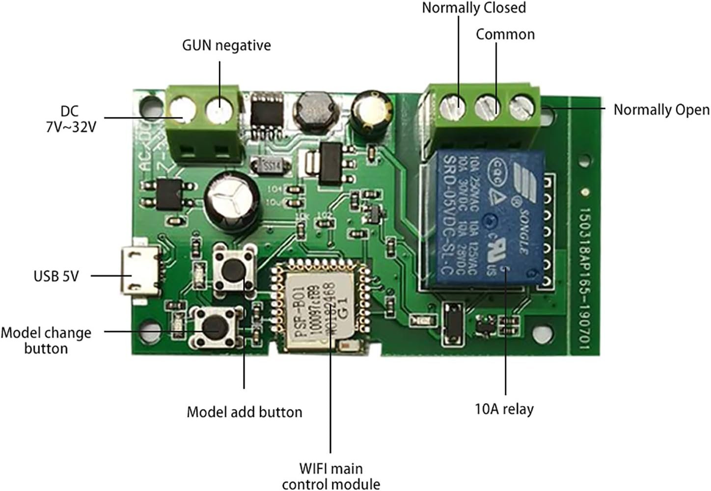 - - - - Note: You can scan the QR code on the package to download the instruction manual. Overview: This wireless switch is a low-cost, affordable device that allows users to remote turn on/off connected appliance of different types and brands via app EWeLink from anywhere anytime in the world, and by setting timing schedules for your appliances, you can maintain an carefree life. It supports inching /self-locking mode. In self-locking mode, customers can remotely turn on/off connected devices immediately. When in inching mode, customers can have two w g ways to select: Turn on 1s and then auto-off, Turn off 1s and then auto-on. Specifications: Operating voltage: 5V/7-32V DC Product channel: 1 channel LEDs: 3 LEDs(indicate working mode, wifi status, relay on/off status respectively) Two input interfaces Supports to control different voltage ranges USB port power supply more convenient Board consumption: <1W Standby current: 80mA Max input current: 10A Max Wattage: 2200W Relay lifespan: ≥ one million times 100M electrical insulation resistance Electric shock voltage: 1000V Relay maximum pull time: 15ms Relay maximum release time: 5ms Working mode: inching /self-locking Wireless Standard: 2.4GHz, 802.11 b/g/n Mobile App: EWeLink on Android/IOS Application: access control, turn on PC, garage door, etc. Computer application: Remote control computer boot Operating temperature: -40 degrees to +70 degrees Operating Humidity 40% ~ 80% RH Item Size: 67*41*20 (mm) Package Information: Package Size: Approx. 10*7*4cm / 3.9*2.8*1.6in Package Weight: Approx. 35g / 1.2oz Packing List: 1 * Wireless Switch Module ✅ *Supports WiFi network. Supports numerous WiFi smart switches on one smart phone. ✅ *Supports remotely turn on or off connected appliances, for example light, electric kettle, electric rice cooker, electrocar, etc. ✅ *Supports status tracking: device status timely provided to the EWeLink. ✅ *Voice Control: Compatible perfectly with "Amazon" Alexa, for Google Home/Nest, IFTTT. ✅ *Supports max 8 enabled scheduled/countdown/loop timers for each device.