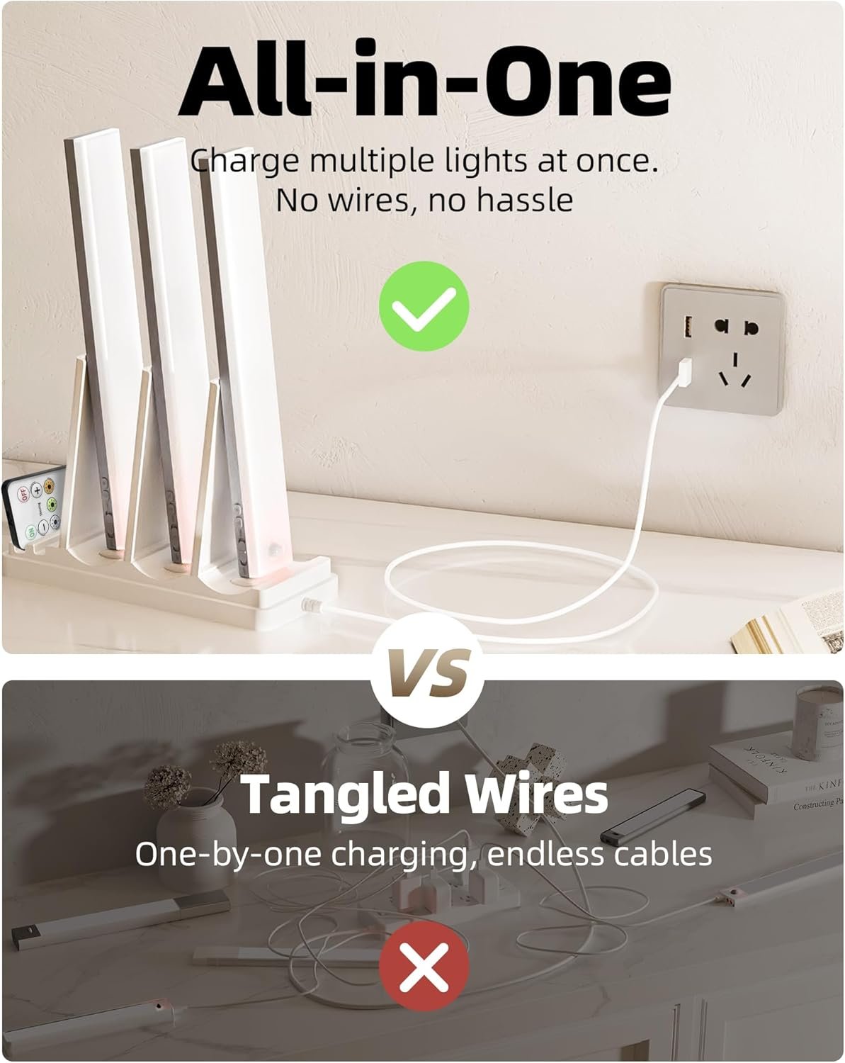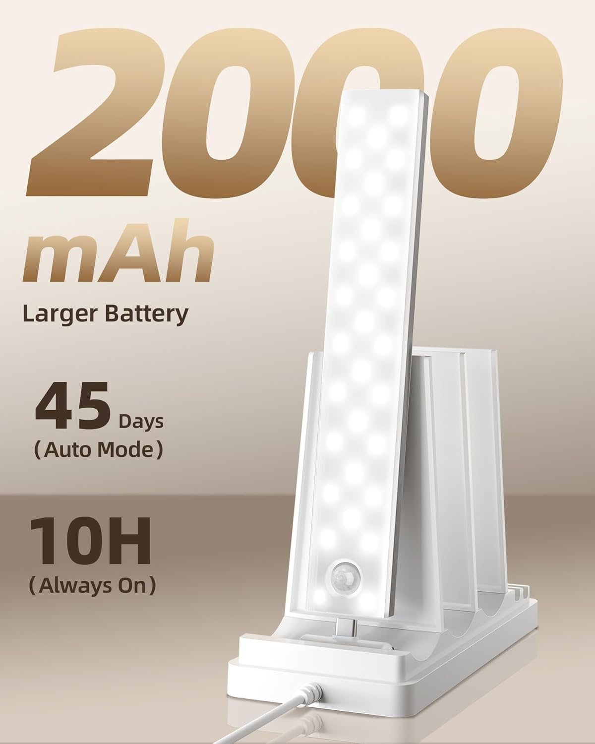 【Long Battery Life & Smart Charging】This 2000mAh rechargeable under cabinet lighting lasts 7-30 days in [Auto Mode] and 8 hours on MAX brightness in [Always-On Mode]. The 3-slot USB-C charging dock keeps multiple lights powered without clutter. Plus, it can charge other devices like phones and headphones, adding extra convenience 【Smart Motion Detection & 3 Work Modes】 These LED cabinet lights feature 2 sensor modes: [Night Mode] activates only in dark environments, and [Day Mode] detects motion at all times whether in bright or dark environments. In both Auto modes, the sensor detects movement within 120° and a 9-16 ft range and the motion sensor lights automatically turn off after 20 seconds of no motion. [Always On Mode] keeps the cabinet lights illuminated but automatically shuts off after 30 minutes of no movement to save battery 【Customizable & Eye-Friendly Lighting】Set the right mood with 3 color options: Warm White (3000K) for a cozy feel, Natural (4200K) for everyday lighting, and Cool White (5700K) for focus and clarity. Adjust brightness with three levels (30%, 60%, 100%) to suit any space or activity. Adjusting the right color temperature and brightness for the right setting helps reduce glare and protect your eyes 【Remote Control & Timer Features】Easily control these under counter lights with the built-in buttons or the included remote. Set them to Always On/Off, adjust brightness, or switch between color temperatures. The remote also features a timer function with: 15, 30, 45, 60, or 120 mins, giving you flexible control over how long the wireless under cabinet lights stay on 【Easy, Tool-Free Installation Anywhere】Our LED closet lights offers 2 installation methods: ① Use the built-in strong magnet to easily attach it to any metal surface. ② Peel off the 3M adhesive tape to stick it on any flat surface. No screws required, making installation a breeze. Perfect for cabinet, kitchens, closets, staircases, bookshelves, pantries, and more 【We Care About You】️—EZVALO truly cares about your experience. If you have any questions, or concerns regarding our under cabinet lighting, please don’t hesitate to contact us. We’re committed to providing excellent customer service and will do everything we can to ensure your satisfaction