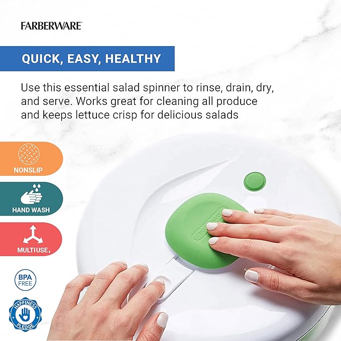 Farberware Easy to use pro Pump Spinner with Bowl, Colander and Built in draining System for Fresh, Crisp, Clean Salad and Produce, 6.6 quart, Green