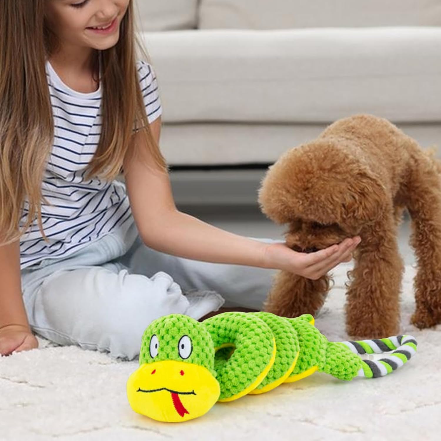 Crinkle Sound Stimulation: The built-in crinkle sound captures your pet's attention and encourages play, helping reduce boredom and destructive behavior in small dogs during quiet time or when home alone. Soft Yet Sturdy Design: Made from high-quality plush fabric with reinforced stitching, this teething toy is gentle on puppy gums while standing up to regular chewing and play from small dog breeds and young pups. Tug of War Ready: Designed for durable tugging games, this toy includes a strong pull rope that supports bonding time between pet and owner while also helping dogs release energy and stay mentally and physically active. Interactive Playtime Fun: This squeaky dog toy combines sound, texture, and movement to keep puppies engaged, featuring a pull rope and crinkle material to encourage interactive play and healthy activity indoors or outdoors.