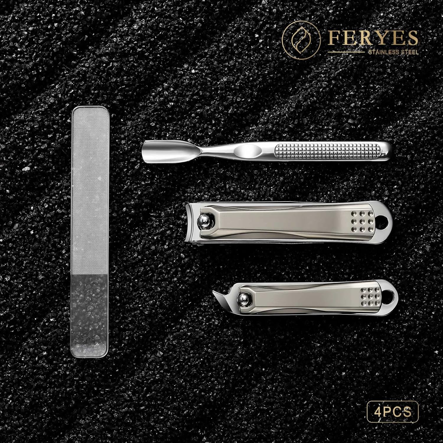[Multi-Functional Kit] All you need for a manicure, in one case. Curved blade nail clipper, slant blade nail clipper, glass nail file, and nail cuticle pusher make the men’s nail grooming kit perfect for everyone. [Easy To Carry] A modern nail clippers set comes with a compact leather slot case and can be carried anywhere you want. The travel nail kit is friendly for home and travel use. [Sharp And User Friendly] FERYES 4-piece nail clipper kit is keen and amiable. A sharp blade edge, glass nail file, and nail cuticle pusher are perfect and friendly for the manicure process. [Supreme Quality] Surgical-grade stainless steel nail clippers for men are characterized by an anti-rust coating and sharp blade edges. Premium stainless steel nail trimmer set offers a smooth feeling of nail cutting that you love. [Perfect Gift] Upgraded manicure set with an elegant and stylish leather case is an unusual gift for your family members and friends on many occasions like birthdays, Christmas, New Year, anniversary, etc.
