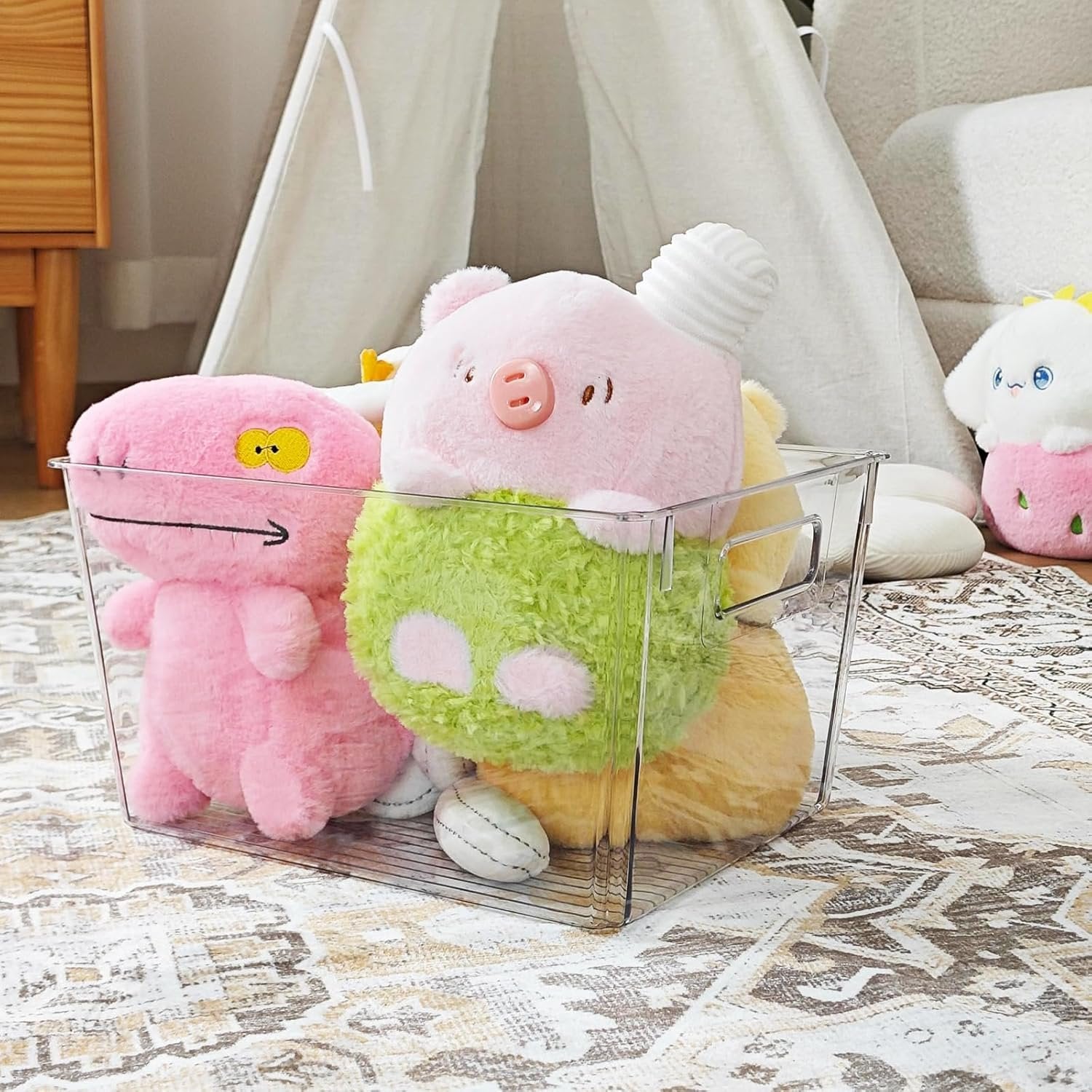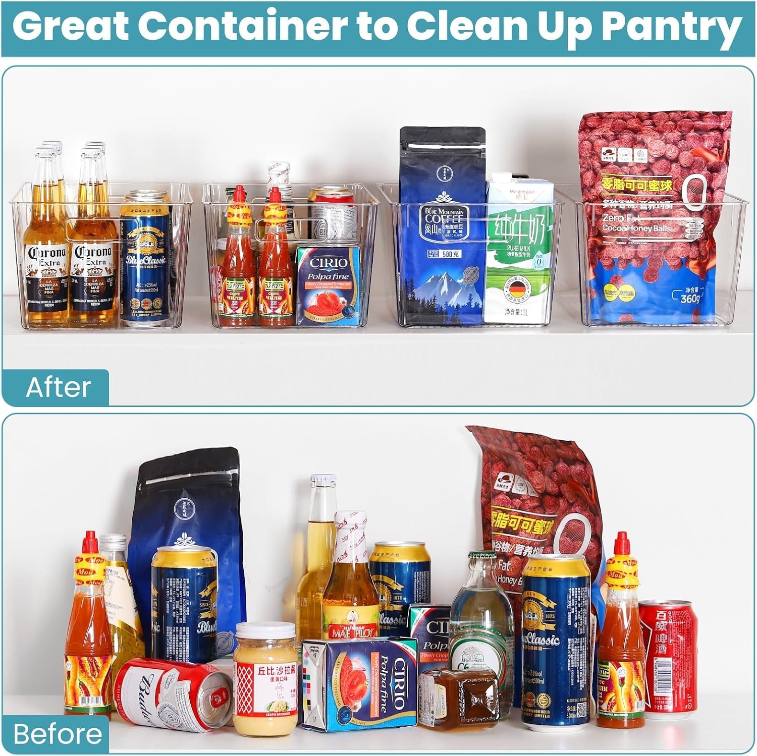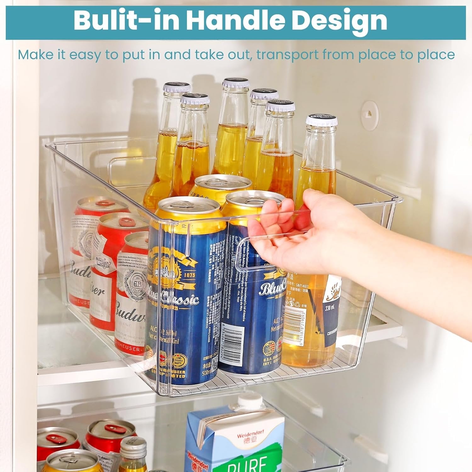 4 Packs Large Size Storage — Each storage bin measures 19.5x28.5x15 cm (WxLxH) These large capacity bins are great for keeping different gadgets & tools, detergent, toys, books and canned goods, fruit, etc, creating more space in your home. Clear and Stackable — Feshory storage bins are made of high-quality transparent acrylic. They are No BPA and sturdy, safe to store food on it. Clear view design allows you to quickly find out the items you need, saving you time. When not in use, When not in use, they can be stacked at will. Built-in Handle — It has Easy-grip side handles on the both edges so you can more easily to take it out or carry. They are very convenient when moving items from the kitchen cabinet refrigerator storage Multi-Purpose — These storage bins are fantasic fridge organiser, under organiser, pantry organiser, big enough to store your drinks, fruits, vegetables, snacks, snacks and detergents and many stuffs. Greatly used for bathroom, kitchen, bedroom. Cleaning Instructions & Guarantee — Please clean it with warm water. These storage bins are NOT available for dishwasher. If you have any problem with our product, please don't hesitate to contact us. We'll give back all cash with no questions asked!