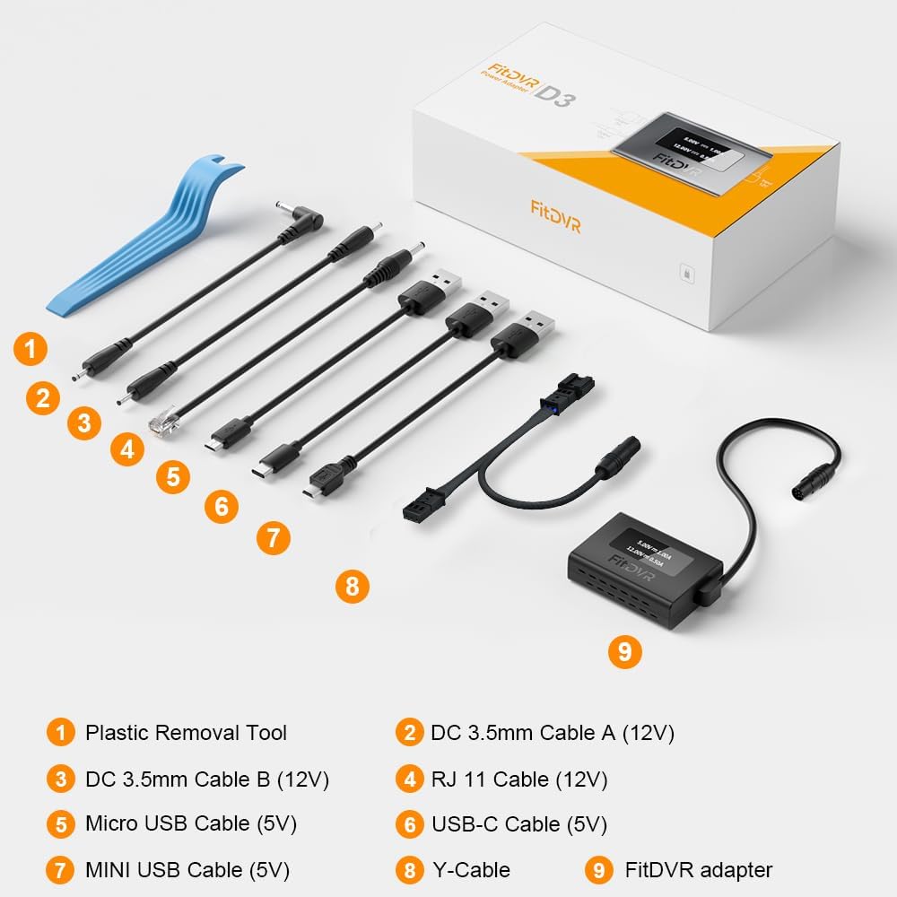 【VEHICLE COMPATIBILITY, 3 PIN, D3-025】FitDVR dashcam power adapter suitable for Audi, Volkswagen and Porsche vehicle models, such as Audi Q4 SQ8 Q3 SQ5 A3 S3 A4 RS5 S6 A8 TT R8 e-Tron ID.4 Tiguan Jetta GolfR GS. TI ID.7 911 Taycan Panamera Cayenne and etc ONLY FOR VEHICLES USED WITH 3 PIN CONNECTORS. Please check compatibility before purchase. *Confirm the adapter models to us if there is any doubt. 【Easy Installation & LED Display】Special wiring for plug-and-play installation. No messy wires, no nasty cables hanging on the cigarette case, tidy and clear. It is easy to install and does not invalidate the vehicle warranty. Our adapters are equipped with an LED screen that displays the current and voltage, which can detect the stability of the equipment operation at any time. 【Dual Voltage & Multiple Output Cables】This dash cam adapter has 2 output options at 5V and 12V (input voltage: 12V). It comes with 4 different output cables: Mini USB, Micro USB, USB-C and DC3.5mm. The DC3.5mm cables have a 12V output, while the other three cables have a 5V output. These power cables meet the interface requirements of most car cameras and radar detectors on the market. 【Optimum Quality & Performance】FitDVR pursues innovation and reliable quality, all our power adapters are made of premium materials and undergo strict quality controls. To ensure effective heat management, we recommend using this adapter to power your car cameras with less than 2A. 【Professional Service & Service】FitDVR independently manufactures and develops different dash cam power adapters, compatible with all car models. In addition, we have different types of cables and wires to support connections to self-darkening rearview mirrors, overhead consoles, rain sensors and other interfaces. We will help you solve any problem or need related to the dashcam power adapter.