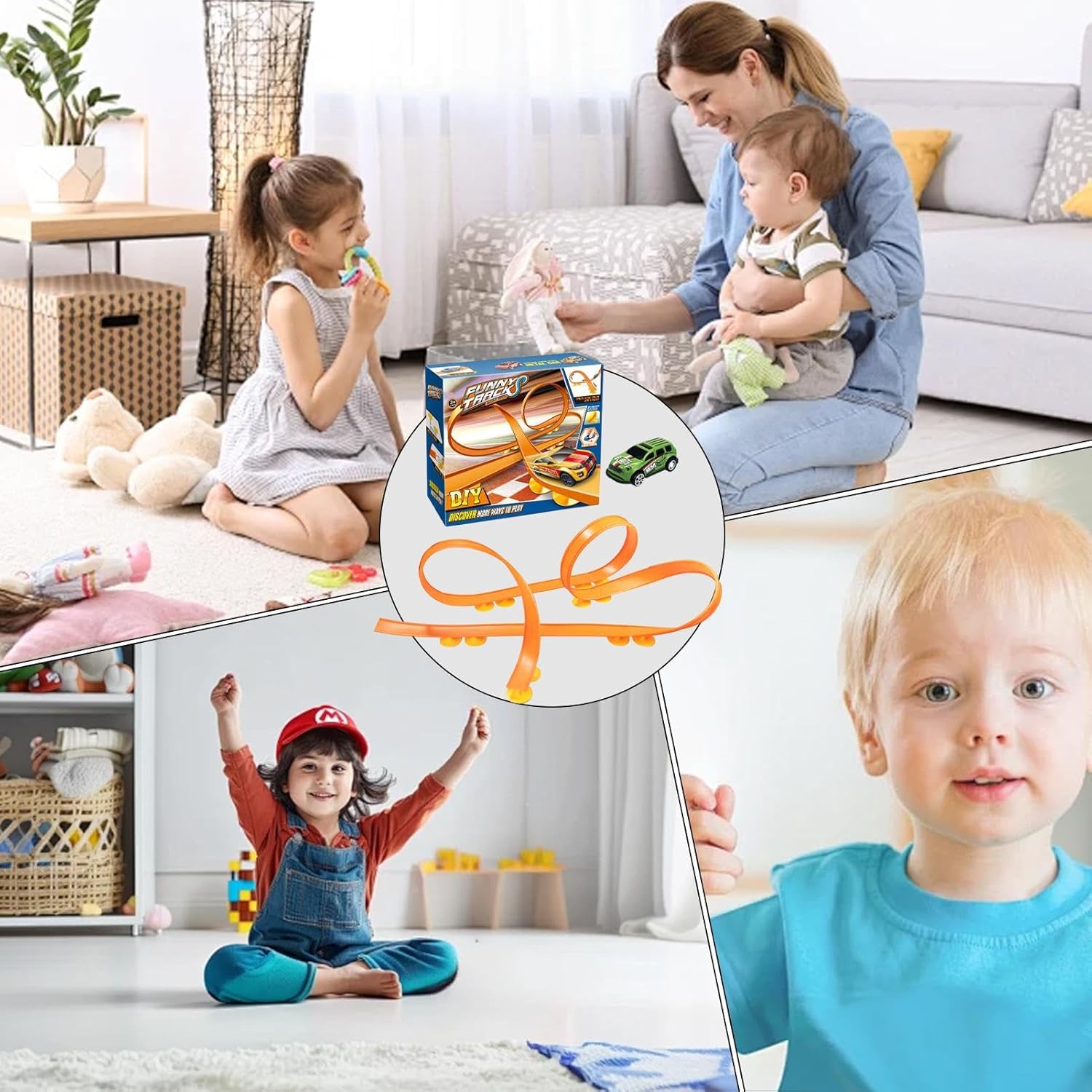 Pull-Back Car Action: Comes with a pull-back race car that zips along the flexible tracks, giving kids a dynamic, hands-on way to play and boosting excitement with every launch—no batteries or charging required. Durable ABS Construction: Made from good-quality ABS material, the track and car are safe, , and built to last through countless play , with smooth edges to ensure safe handling by young children. Good for Festive Occasions: Great for Christmas, Halloween, or family gatherings, this toy promotes interactive group play and creativity, making it an option for and young children alike. Compact and Easy to Store: Lightweight and neatly packed into a 26x23x7cm box, this flexible track set is easy to transport and store, making cleanup simple and ensuring you can take it anywhere for portable playtime.