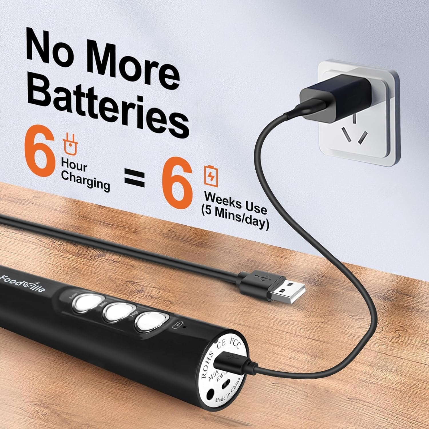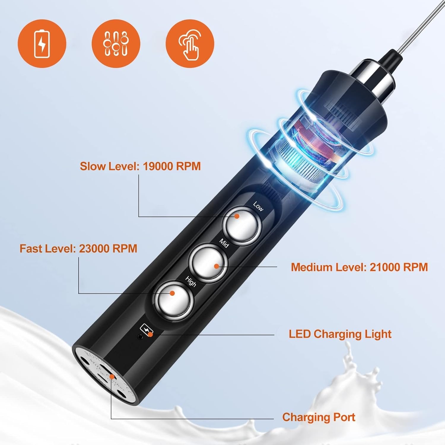 Professional Kitchen & Barista Tool: With 2 versatile whisks, the FoodVille electric milk frother is one of the best kitchen essentials to make the perfect milk foam for your morning & afternoon coffee, and to help you get smooth batter consistency & fluffy whipped cream in 5 minutes. Multiple Whisking Speeds: 3 Gears allow you to choose the proper whisking speed from 19000rpm, 21000rpm and 23000rpm. The higher speed you choose, the less time you will spend, and the thicker foam you will create. Great Power, Remarkable Durability: Equipped with an innovative, super premium motor, the must-have handheld foam maker gives long-lasting and reliable performance. Double layer design whisk ensures that you get silky and creamy milk with ease. EASY TO CLEAN: The stainless steel whisk and removable milk container can be washed in the top rack of the dishwasher for simple maintenance. Ultra-Portable & Extreme Convenient: The frothing wand is powered by built-in rechargeable battery, letting you charge anywhere without hassle battery replacement. Turn the wand upside down on the countertop, you can concentrate on other kitchen operations.