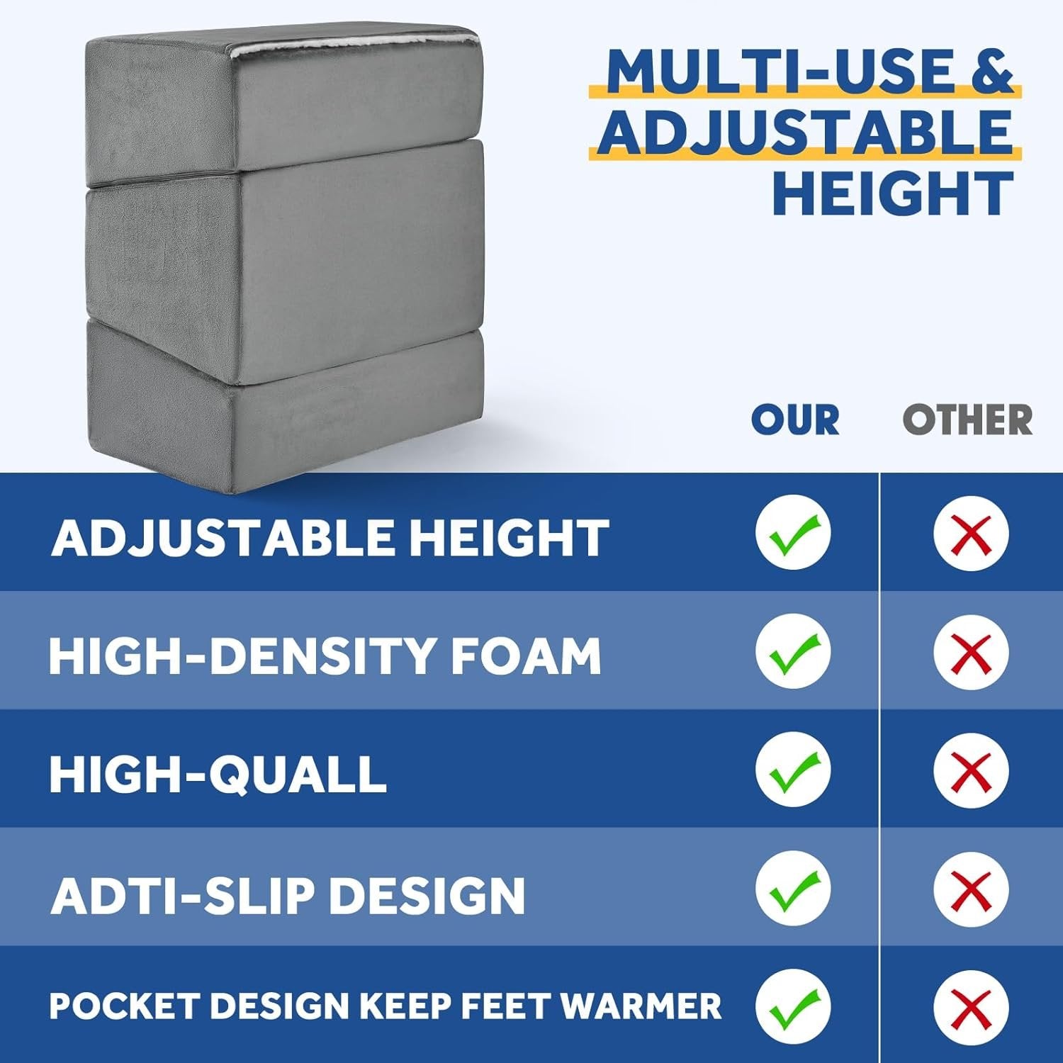 ❤ [ Adjustable Foot Rest ] Wantell footstool offers you 3 adjustable height options of 6 inch and 11inch, 17inches. You can increase or decrease the number of layers according to the needs of different scenarios to maintain the correct sitting position while providing you with maximum comfort. ❤ [ Firm Support Foot Stool ] Different from other soft foot pads with no support,This office foot rest won’t let your feet sink In. If you're looking for a foot rest that will actually do its job, look no further! Our foot stand is specifically designed to provide optimal support and comfort. Made from high-quality materials, it's built to last and will definitely help you get the most out of your feet! ❤ [ ErgonomicFoot Rest for Chair ] This pain relief foot rest under desk is perfect for those who spend long hours sitting, as it provides additional support and helps to reduce pressure on the legs.You won't be disappointed! ❤ [Stay In Place with non-slip Bottom ] Our Computer Foot Rest Under Desk features a slip-resistant bottom surface to keep it firmly in place. So whether you're working at your desk or relaxing at home, you can focus on what you do best without worrying about your foot rest getting in the way. ❤ [ Best Gift for Family and Friends (Home Office Must Haves) ] This office accessory would be a sign of care and attention to family member, friend, office staff, driver, student, teacher or anybody who sits a lot. ❤[ Foot Rest with warm pocket ] This cozy feet rest comes with a built-in sherpa plush pocket for your feet. Our footrest does not need to use electricity or battery.This Foot Rest For Under Desk at Work Will Keep Your Feet Warm And Toasty!
