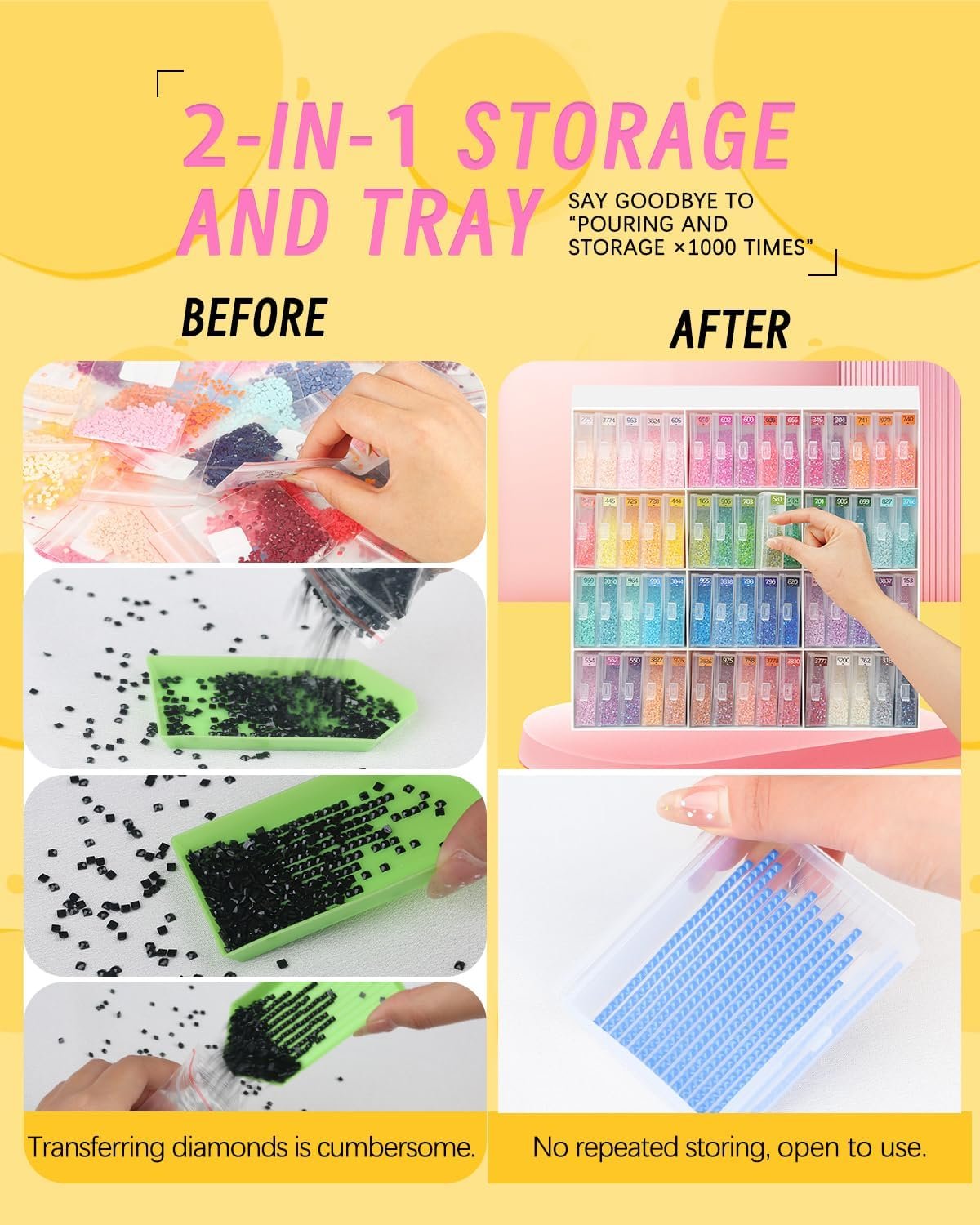 What You Get: This kit includes 60 Diamond Art Trays with Lids, 455 sparkling diamond painting labels, and a Diamond Art Organizer rack. These thoughtfully designed Diamond Art Accessories and Diamond Painting Tools are perfect for neatly organizing your diamonds and enhancing your crafting efficiency. The ideal Diamond Painting Supplies for all your creative projects! 2-in-1 Diamond Storage and Tray: Our diamond art kit seamlessly combines diamond painting storage containers with functional trays. Designed for convenience, the diamond art storage box minimizes the hassle of transferring diamonds during crafting. The diamond art trays with lids allow you to simply remove a tray, open the lid, and start creating with ease. Perfect diamond art supplies for organizing your diamond art accessories and tools while enhancing workflow. Multifunctional Diamonds Storage Rack: This storage rack for diamond art accessories is designed to stand on your desk, saving workspace, or to be wall-mounted with four pre-drilled holes for added convenience. Perfect for organizing your diamond painting tools, diamond art kit, diamond painting kits for adults, 5D diamond painting for adults, and diamond painting trays with lids, maximizing space and enhancing accessibility. Premium Service: We specialize in providing high-quality diamond painting kits, diamond art kits, and diamond painting accessories. If you are not satisfied with your purchase, please contact us promptly through Amazon. Our foreveryoungdiy team is dedicated to delivering a solution that meets your expectations. Thank you for choosing our products—we look forward to supporting your creative endeavors!