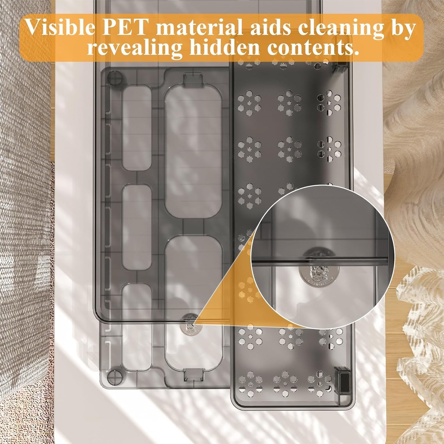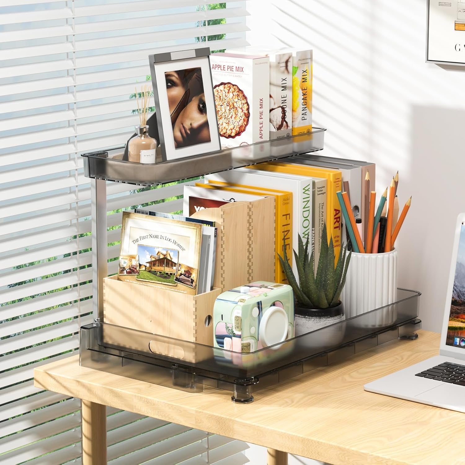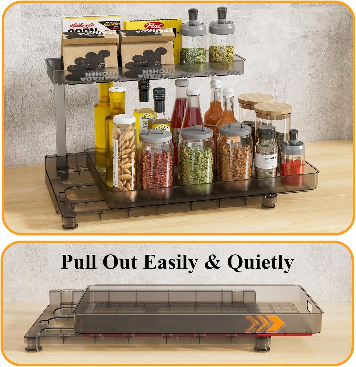 Convenient to use: Pull out L-shaped under sink organizers and storage makes room for pipes and garbage disposal. The design works well under sink, as the top rack can be easily installed on the left or right side, flexibility to work around pipes Multi-purpose: Perfect fit the under sinks, bathrooms, cabinets, countertops, kitchens, laundry room,food pantries, offices, and other places. Can be used as bathroom toiletries storage, kitchen spice rack or office supplies shelf, etc Unique Design: Under sink organizer is made with PET plastic, the double tier level is held up by thickened rods, strong and sturdy. The baskets with hollow design for good drainage. Easy to clean, just wipe the surface with a damp cloth Universal Dimensions: Bathroom storage suitable for most under-sink cabinets, the tray also can effectively using the vertical space to store cleaning supplies, making your items well organized and stored in an orderly manner Installation Takes Only 1 Minute: Transform your kitchen in an instant with our kitchen pantry organizers and storage cabinets without tools or drilling. In just a minute, you'll have a better looking, tidier space ready for your culinary adventures