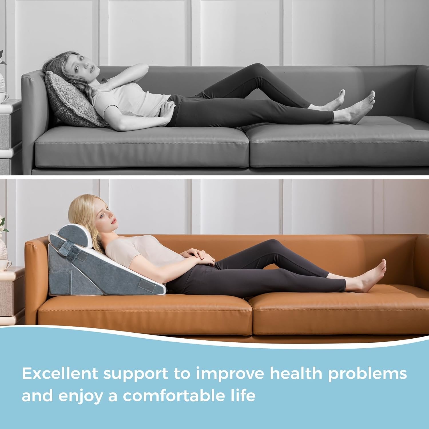 10-in-1 Adjustable Design: Enjoy ultimate versatility with a 10-in-1 adjustable wedge pillow set, designed to support your body in various positions—whether sleeping, reading, working, or recovering post-surgery—offering customizable angles and heights for optimal comfort and alignment. Ergonomic and Versatile Support: Designed with a 20° and 30° angle and adjustable heights (9, 12, and 22 inches), the wedge promotes optimal spinal alignment and reduces muscle strain. The set includes a detachable half-moon bolster pillow for added comfort and support where you need it most. Safe Certification: The main body of the wedge pillow is constructed with high-density support foam, providing firm and stable elevation that resists deformation over time while delivering consistent full-body support. Additionally, it meets the highest safety and quality standards, being certified by CertiPUR-US, ISPA, and Standard 100 by Oeko-Tex, ensuring a safe and healthy choice for your sleeping needs. Healthy Partner: These bed wedges and body positioners are designed with your health in mind. The wedge pillow enhances overall well-being by improving circulation, promoting smooth breathing, and reducing snoring and heartburn. It alleviates knee pain, back pain, varicose veins, and edema, making it an essential companion for recovery and everyday comfort. Easy to Care: The wedge pillow set features a removable, machine-washable cover made of breathable air-layer fabric for effortless maintenance and lasting freshness. Thoughtfully designed with side pockets for storing essentials like your phone or remote, and a portable handle for easy transport, its foldable design also ensures convenient storage and travel. Warm Tips: For optimal performance, allow the wedge pillow set to fully expand in a well-ventilated area for 24–48 hours after unpacking. To expedite the process, you can use a low-temperature dryer. Be sure to close the velcro when you remove the cover, and regularly wash the removable cover to maintain its cleanliness and softness.