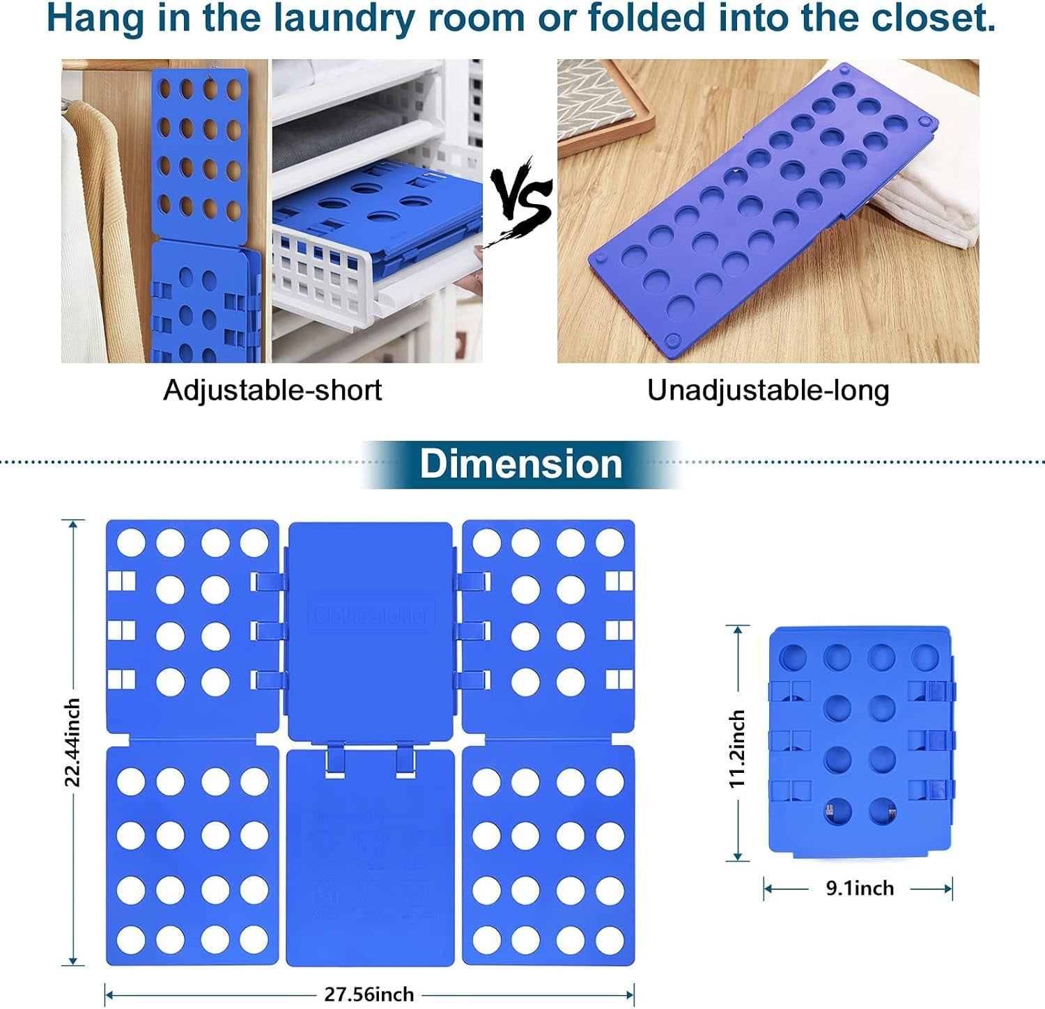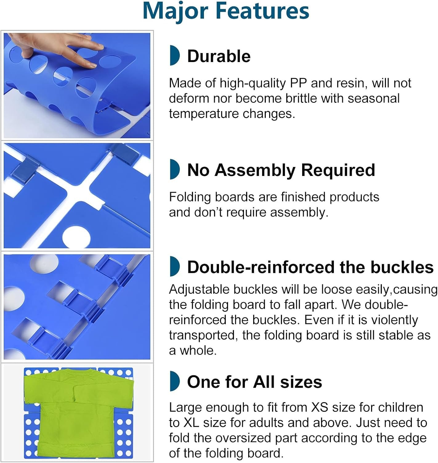 PP composite material is with better toughness, anti-aging, more than 3-year service life. Solve the family's troubles that too many T-shirts, sweaters, dresses, towels, pants and other clothes need to be folded. No assembly required, 2 silicone buckles firmly connect panels. Even if there is a severe collision, the shirt folder will not fall apart. Both adults and children can operate with one hand, making it convenient and simple to fold clothes. The shirt folding board can easily organize the entire wardrobe without too many steps. The folded size is 9"x11.4" and 1.3 pounds. Clothes folders can be easily stored in a drawer or a suitcase. The unfolded size is 27.16"x22.44", and clothes of different sizes can be folded.