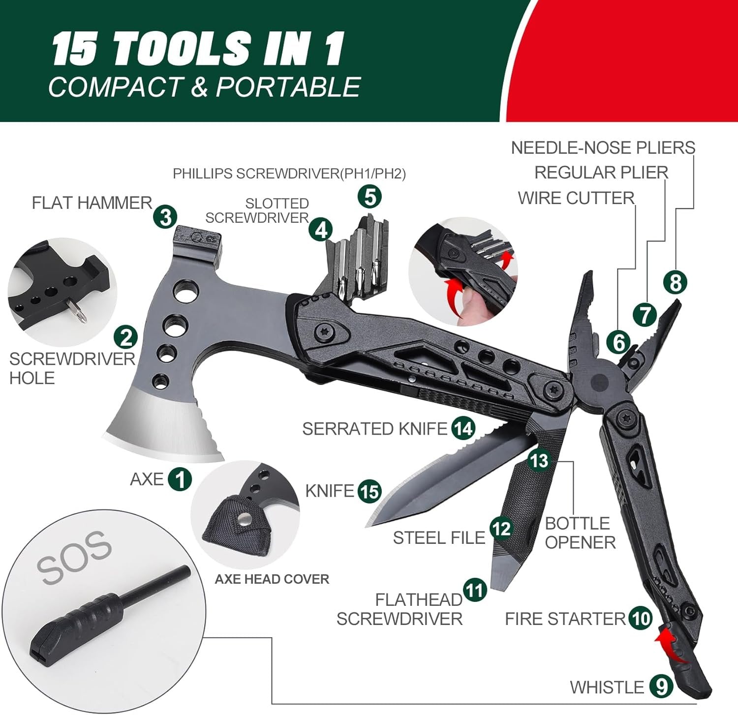 Gifts for Men: Our cool multitool axe is perfect for giving as gifts for men. This is a nice hiking gear for men, husband, dad. Whether as fathers day gift ideas or stocking stuffers for men, this camping accessories will never let you down. Our camping essentials are the ultimate stocking stuffers for him this Christmas! This is the most desired stocking stuffers for men or christmas gifts for men. Anyone who receives this stocking stuffers for men will love it 15 in 1 Camping Gear: This camping accessories comes with 15 different functions, including Flat Hammer, Screwdriver Hole, Slotted screwdriver, Phillips Screwdriver(PH1/PH2), Axe, Slotted Screwdriver, Serrated Knife, Flatted Screwdriver, Bottle Opener, Steel file, Wire Cutter, Regular Pliers, Needle-nose Pliers, Fire Starter and Whistle. It was great to give the practical camping accessories as stocking stuffers for men, him Sharp & Sturdy: It is made of sturdy stainless steel, Black coating is stylish and durable, user-friendly handle design, comfortable grip, quality center of gravity control for better cutting and hammering. It helps you chop, cut, and hammer when you're camping, hiking, or surviving. This camping essentials is suitable for christmas gifts, fathers day gift, stocking stuffers for men or gifts for men. They are also great fathers day gift ideas to really show your love for him Compact Design Multitool: Our camping accessories features a compact design. It can be hung on the belt or put into the survival kit, which is a convenient and practical camping accessories and fishing accessories. Dual blade protection design ensures safe daily use. It will be a great help in case of danger in the field. It is the essential tools in your survival kit. As a fathers day gift or stocking stuffers for men him, and let him enjoy the outdoors with confidence Practical Gifts for Outdoor Enthusiasts: It is an excellent camping accessories, camping gear and hiking gear. It would be excellent fathers day gift ideas, fathers day gift, christmas gifts for men, stocking stuffers for him, stocking stuffers for men, husband. Practical fathers day gifts, mens stocking stuffers, Christmas gifts for men. This personalized gifts for men will bring joy to the person you give it to