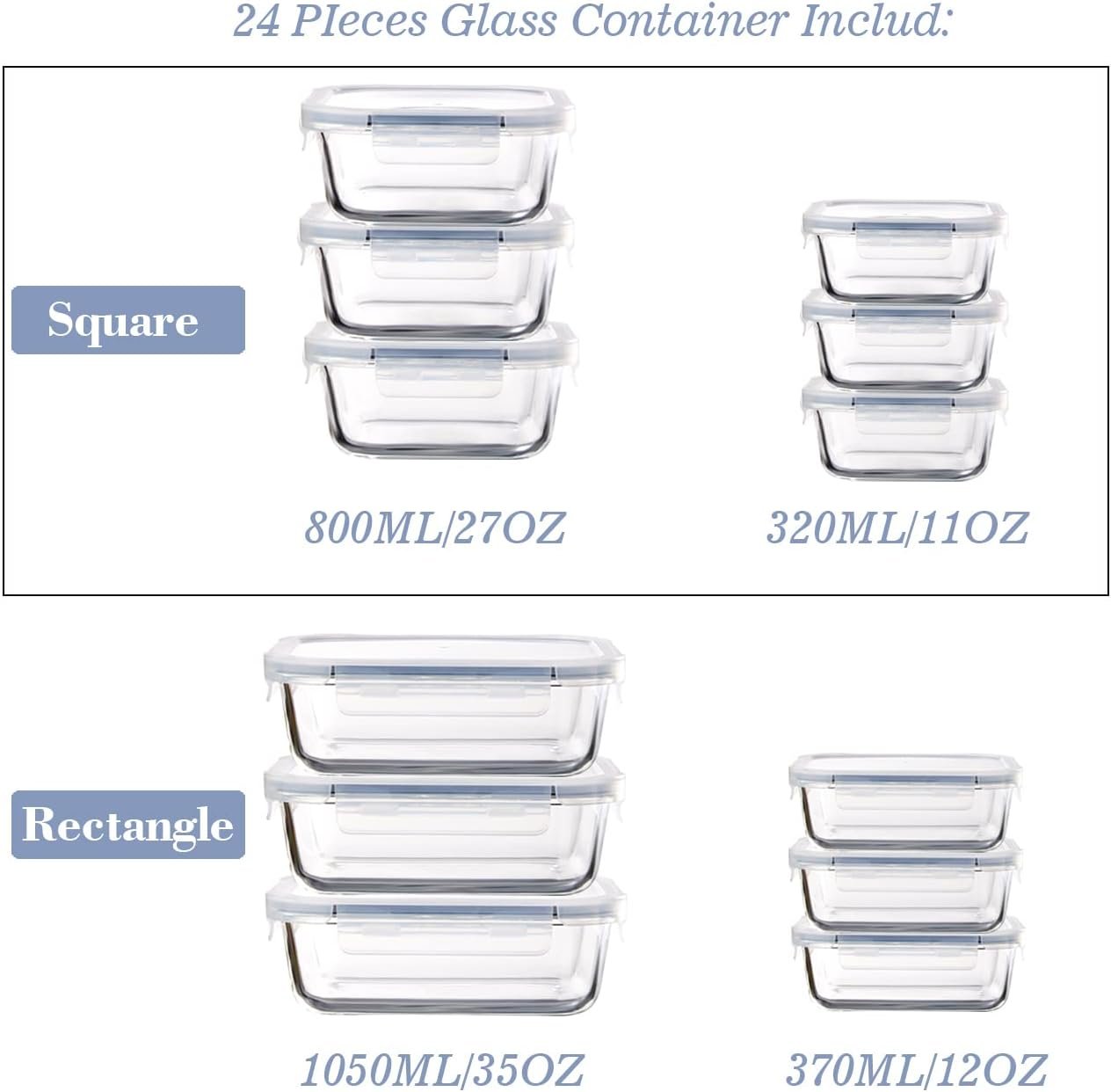 Brand-Generic Colour-Black Material-High-borosilicate glass, Silicone ring ,BPA free plastic lids Material feature-Oven Safe Glass Food Storage Containers with Lids Airtight, Glass Meal Prep Containers for Lunch Food Storage with Lids, Glass Food Container Set, Glass Bento Box for Kitchen, BPA Free(24 Pcs) Glass Food Storage Containers with Lids Airtight, Glass Meal Prep Containers for Lunch Food Storage with Lids, Glass Food Container Set-100% Leak Proof -BPA Free-Microwave, Oven, Freezer and Dishwasher Safe [12 PACK GLASS CONTAINERS] include 12 glass+12 lids :Rectangle container: 3x370ml(1.6 cups),3x1050ml(4.5 cups), Square container: 3x330ml(1.4 cups),3x800ml(3.4 cups), (Please allow 0.1- 0.3 inch in differs due to manual measurements, your understand will be much appreciated) The containers are versatile to meet your everyday food storage requiements, perfect for prep meals at home and bring it to work, school or the gym, travel and more. [OVEN,MICROWAVE(Not the lids), DISHWASHER SAFE /FREEZER SAFE] from -40℃/-40℉ in freezer to 400℃/752℉ in oven, safe for oven(Not the lids), microwave(Not the lids), dishwasher and freezer .It's safe to wash the lids in the dishwasher, but high temperatures over a long period of time can deform the silicone sealing strip at the edge of the lid. Please wash the lids by hand as much as possible. [BPA FREE]- The Glass Storage Containers are BPA Free, and made out of high-borosilicate glass for easy heating and durability. non-porous glass, Free of Harmful Chemicals.(BPA free lids, specially designed snap down, no leak lids are completely air and liquid proof.) [LEAK PROOF, STACKABLE/ EASY CARE] Glass food storage containers use lock lids that comes with silicone seals to ensure your meal prep food will last much longer than normal plastic food storage containers. These lids are easy to use and will stop leaking. These lids will not break or slowly stop working. [AFTER SALE SERVICE] WE offer 24hours after-sales service. If you are not satisfied with your products or receive defective items, please contact us, we will provide the best solution to refund or resend within 24 hours