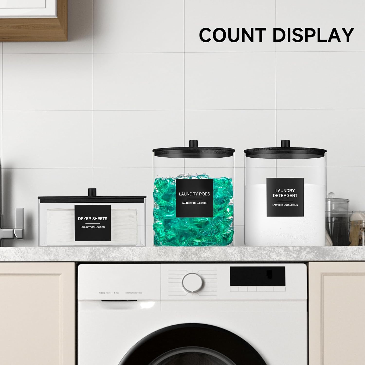 Glass Jars and Acrylic Dryer Sheet Holder, Laundry Pods Container with Bamboo Lid and 27 Labels, Powder Detergent Containers for Laundry Room Organization, Storage Jars Set (3 Pack, Black)