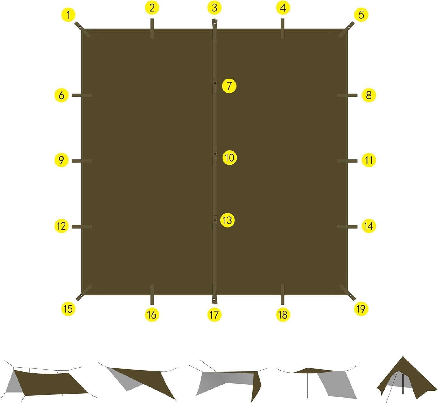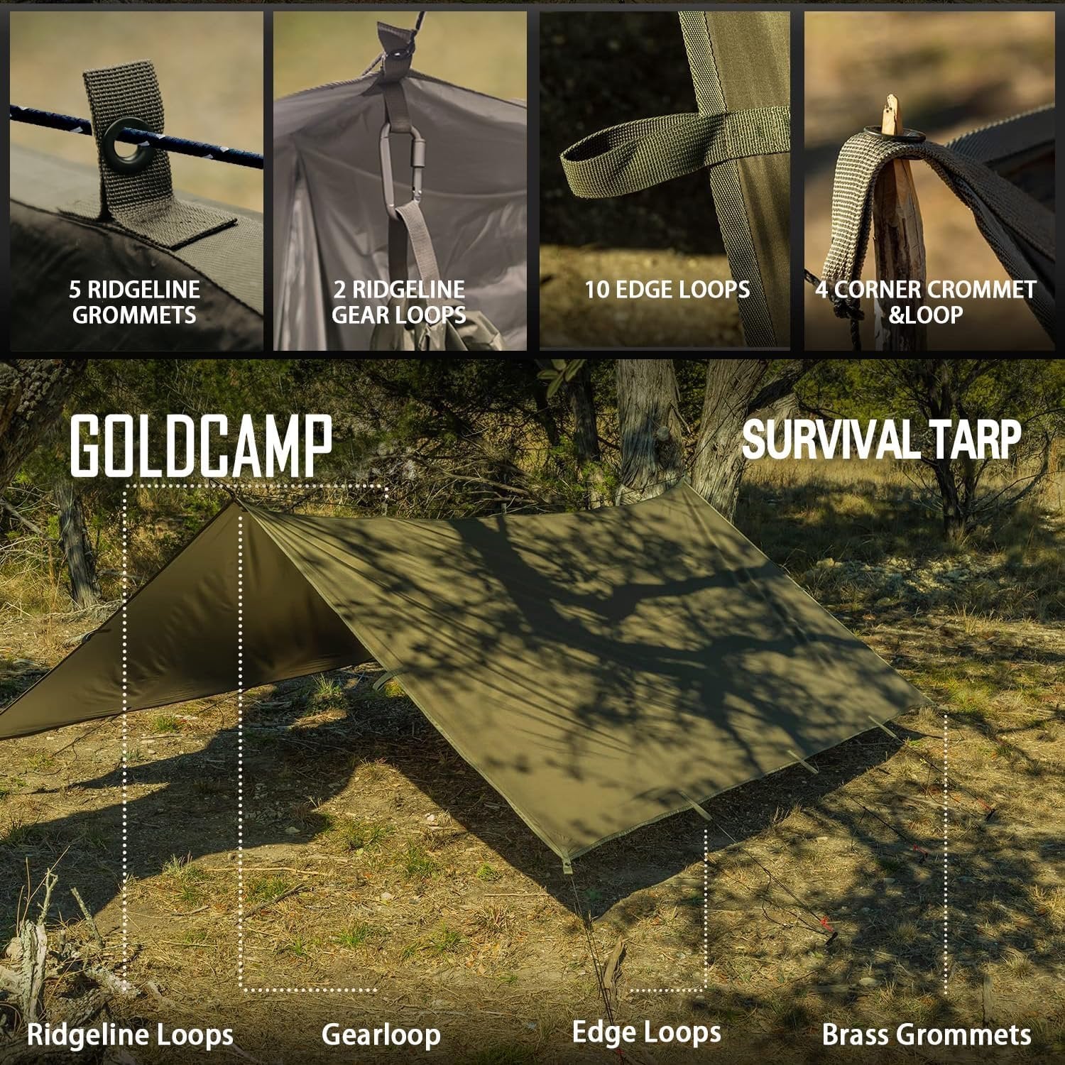 ushcraft Tarp has superior puncture resistance and industry-leading 15,000mm waterproof PU coating. 70D Ripstop Nylon With a total of 19 reinforced webbing loops,you’ve got all angles covered, you can even use the top center loop to make a teepee, attach the side loops to a tree, fence, or peg into the ground and go directly over the top of your tent you don't even need trees! Bushcraft Survival Tarp designed to fend-off rain, cold and hostile environs, this rugged waterproof tarp helps you overcome outdoor adversity in any season 10’ X 10’ tarp offers plenty of room for you and an associate to hunker-down when circumstances go awry. String it between trees as a survival-shelter or use it to create waterproof tent flooring. A must-have addition to survival gear and equipment, it can even be used as an emergency blanket with the reflective side helping to preserve body heat. Aluminized polymer deters heat loss when this emergency tarp is used as a camping shelter. In summer, it helps you stay cooler by reducing UV absorption. Portable: easy to fold and disassemble, the product also comes with an easy-to-carry bag for easy transportation and storage.