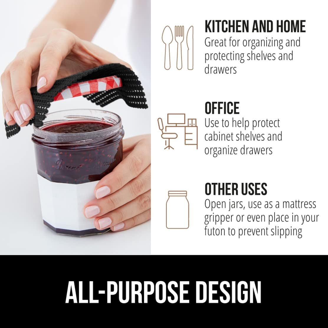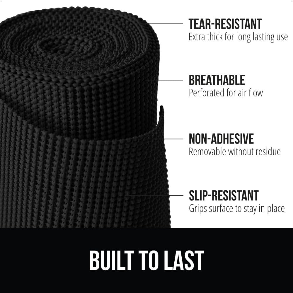 EXTRA STRONG GRIP NON-ADHESIVE LINER: the Gorilla Grip powerGRIP liner is a non adhesive and tear resistant liner engineered with the highest quality materials to reduce slipping and bunching in your drawers or cabinet shelves; superior gripping technology keeps both the liner in place on surfaces KEEP ITEMS IN PLACE: thick and durable Gorilla Grip Drawer and Shelf Liners line your drawers and effectively helps to prevent items from moving and shifting around REFRESH YOUR DRAWERS AND SHELVES: add a quick refresh to any surface for a beautiful transformation while keeping cabinets and drawers organized; liners also offer surface protection from dirt and debris, and help prevent items from scratching the inner surface of your cabinets KITCHEN, OFFICE, OR BATHROOM: liner can be used in several areas of your home; use it in your kitchen, pantry, work station, office room, laundry room, bathroom vanity shelves and more; perfect for organizing your space and home; use any excess liner pieces for opening jars and can also work great for a slipping futon, couch cushions, or mattresses EASY INSTALLATION: for unique sizes and shapes simply trim the liner with a household scissor; place the liner down in your drawer or cabinet and trim off excess material; wipe drawer or cabinet down first; to clean, use soap and a damp cloth or sponge