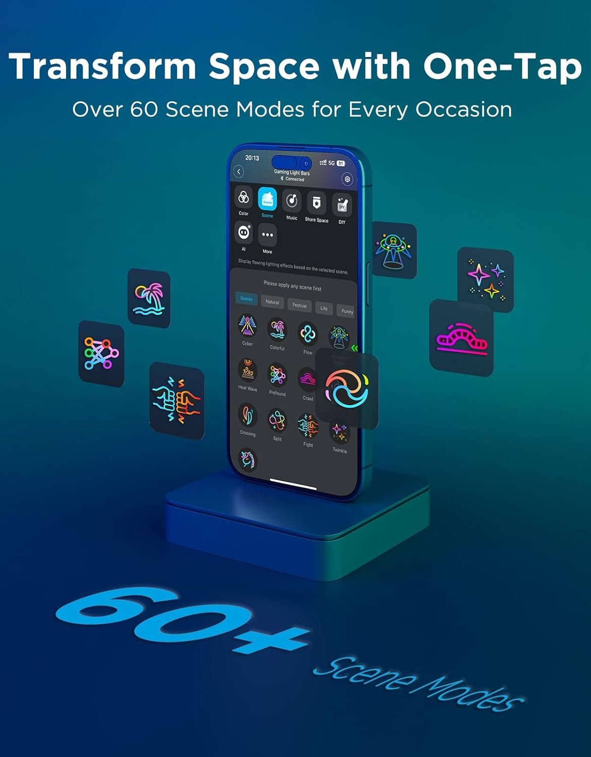 Industry-First Triple-Sided Illumination: Upgraded light bars with 16M accurate colors. The front and base sides feature transparent mecha plates and suspended diffusion, creating a futuristic 3D lighting experience Cyberpunk Design: These gaming light bars utilize metal texture spraying technology to create a fashionable cyberpunk appearance. The weighted base ensures stability, without any complicated installation steps Govee DreamView Light Show: Govee Desktop (Windows only) syncs RGBIC lights to your screen in real-time. Experience immersive gaming with ultra-responsive lighting that matches every high-speed scene change. Razer Chroma compatible Matter-Supported Smart Lights: Voice-control colors, brightness & power via Alexa/Google Home. Create cozy scenes, set schedules, and sync with your smart home—no hub needed. Instant responsiveness for seamless smart lighting Vibrant Lighting Options: Unleash 60+ dynamic scenes via Govee Home App—from competitive gaming to chill movie-night hues. Take full command with independent front, back, and base light control to engineer a perfect multi-zone immersion experience Music Sync Lighting: The built-in mic detects ambient sound to dynamically sync colors and effects. Enjoy ultra-responsive, natural lighting transitions that deepen immersion in games and movies—all without any complex setup