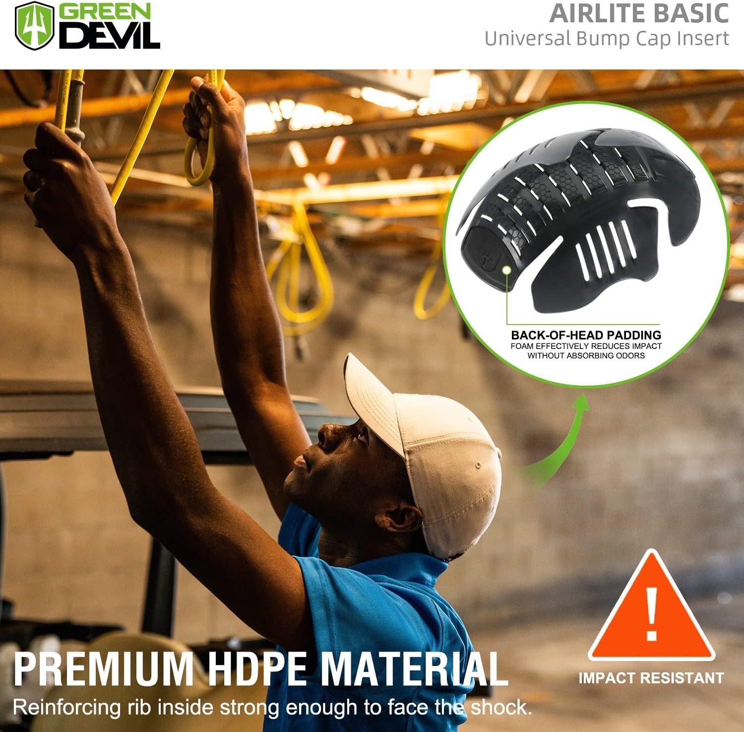 【Impact-resistant Protective Bump Cap Insert Shell】GREEN DEVIL Airlite Basic bump cap insert is made of a lightweight, high-density HDPE material ,hard to fade , tough and reliable, which can be applied for long time use. Exquisite workmanship, the smooth surface will not hurt your hair or head.Effective protection against bumps, scrapes, bruises and other head injuries. Great for for a variety of outdoor activities or low-risk workplaces. 【Convert Your Favorite Baseball Caps Into Lightweight, Comfortable Bump Hat】The flexible sides&edges of the insert shell allow it to good fit in most baseball cap or truck cap.One size fit most,satisfy the different head shapes needs of ball cap owners. Easy to use, can be easily and conveniently installed into a variety of hats, caps and headgears. 【More Comfortable and BREATHABLE】The customized bump cap insert is designed to offer maximum ventilation for continuous airflow and superior breathability—all without compromising protection. 【Extra Protective Design】The protection of the back of the head is often overlooked. Unlike other brands of bump cap inserts, our bump cap insert specifically adds a protective design for the back , providing more comprehensive and thoughtful protection for you. 【Safety Application】This bump cap insert ideal for mechanics,automobile assembly,maintenance,industrial manufacturing,urban rail transit, workshop processing, outdoor sports, airline baggage handlers, as well as workers in warehouses,factories, in-home services and other industries that do not require safety hard hat protection but still need protection against worker-generated injuries.
