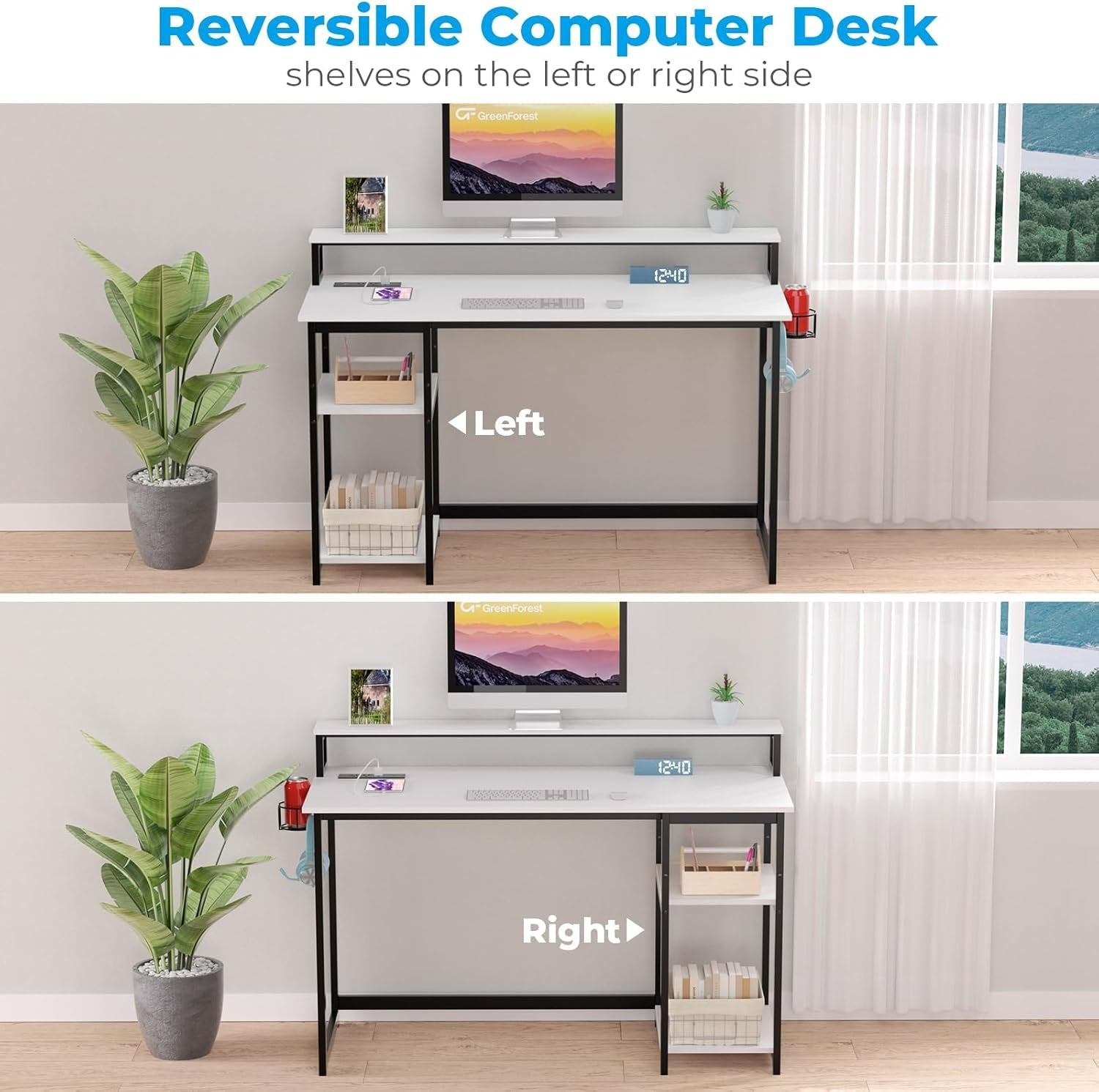 GreenForest 40 inch Home Office Desk with Power Outlets, Small Computer Desk with Ergonomic Monitor Stand, Reversible Gaming Desk, Modern Study Desk, Laptop Desk, White