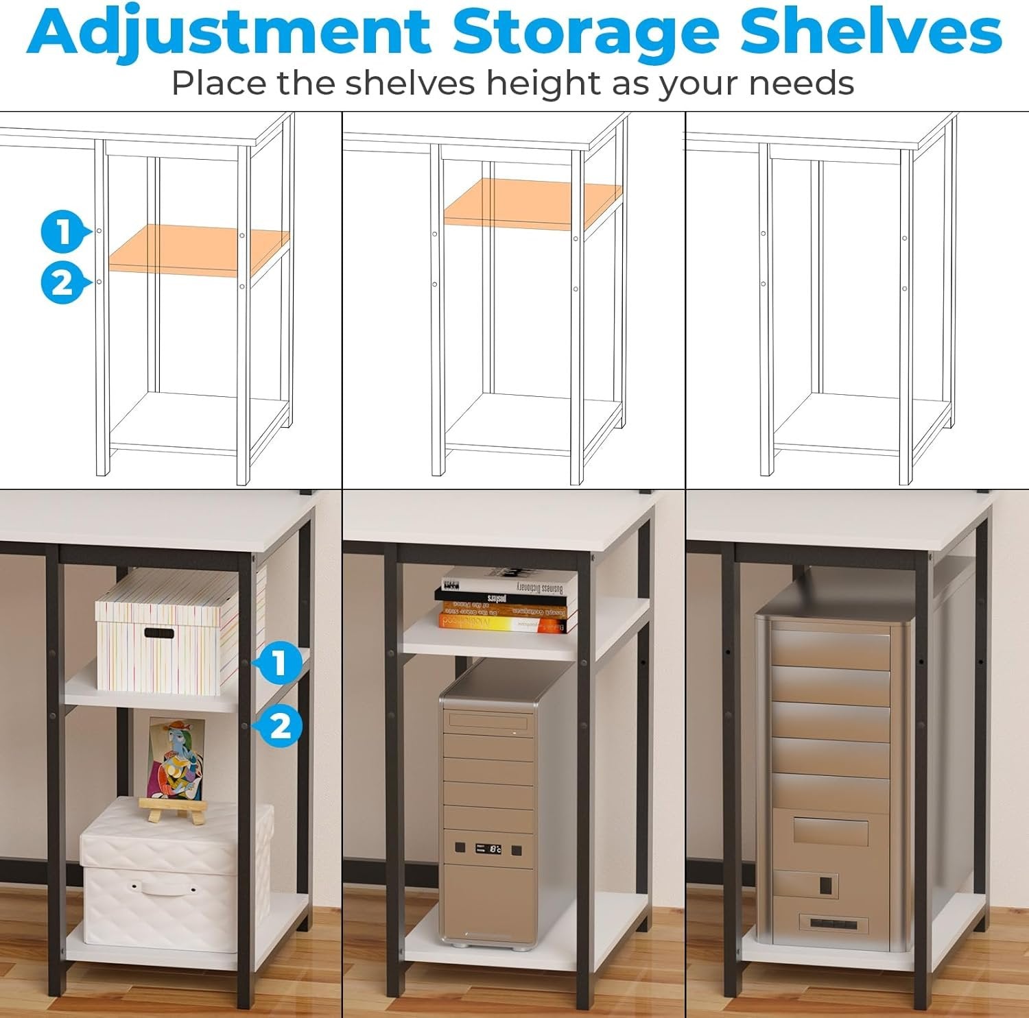 Convenient Power Outlets: 3 power outlets and 2 USB charging ports, making it easy to charge your office devices while keeping your workspace clean and tidy Built-in Monitor Stand: Includes a full monitor stand for 2 monitors or laptops, reducing neck strain and promoting better posture with an ergonomic sight level Reversible Storage Shelves: Two-tier storage shelves on this computer deak are adjustable and reversible, maximizing your home office space and keeping your items organized Space-Saving Design: A cup holder and a hook, keeping your drinks and headphones within easy reach and making your workspace more convenient and organized Sturdy Construction: Constructed with a 40mm premium metal frame and thick particleboard, the studio desk is stable and sturdy, ensuring a reliable workspace. Measuring 19.68"D x 39.37"W x 29.5"H, it fits perfectly in any space