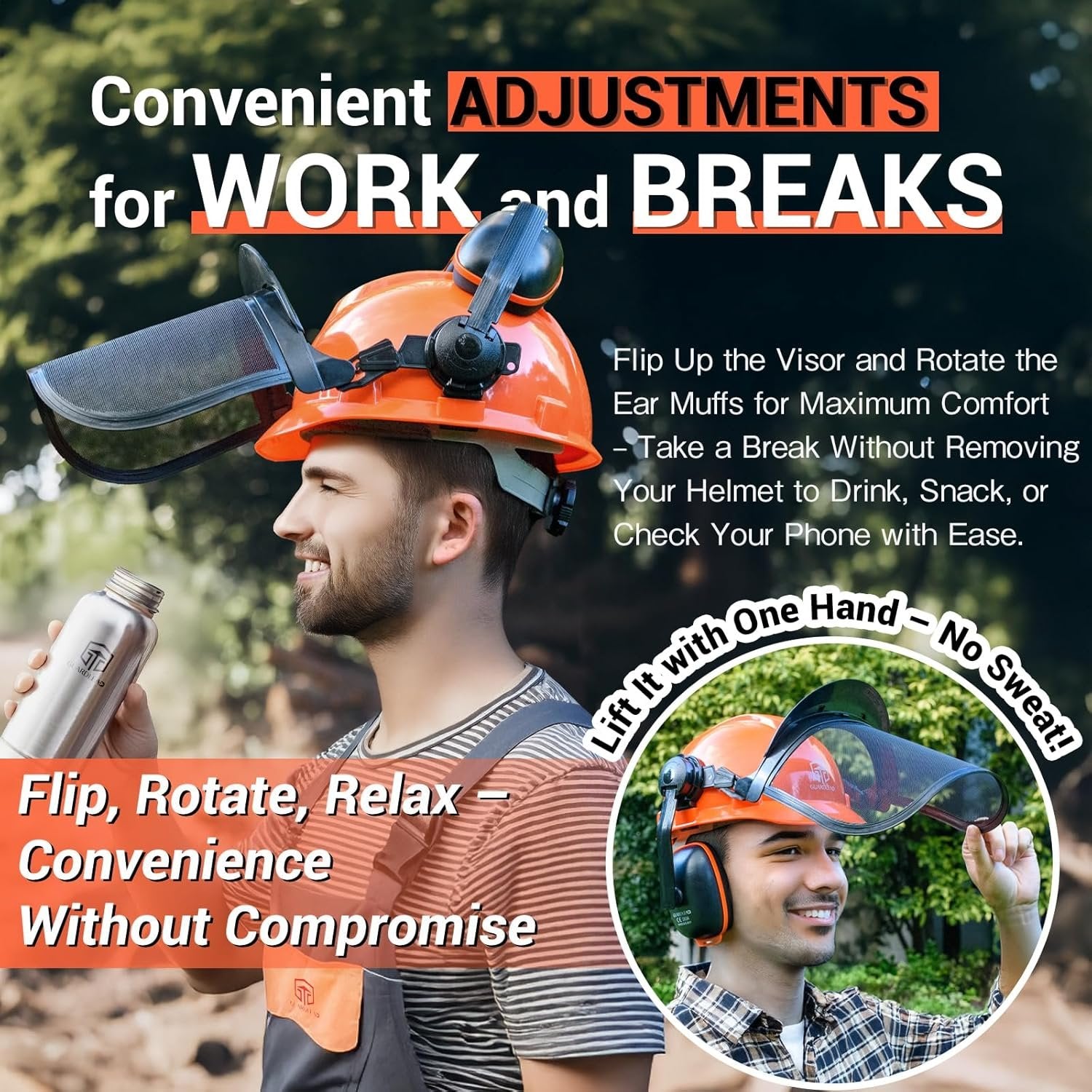 HARD HAT EYE AND EAR PROTECTION. C009R Professional Forestry Helmet comes with an adjustable metal mesh visor for protection from flying debris, a polycarbonate face shield for extra eye protection, and a pair of adjustable 23 dB SNR earmuffs that drastically reduce noise for hearing protection. USE IT ANYWHERE. While this lightweight hard hat is made for professional forestry work, it also guards against injury while using chainsaws, hedge trimmers, shrub trimmers, bush-cutters and other tools that require face, ear, eye and head protection while you work. FULLY ADJUSTABLE. The internal headband adjusts easily to fit heads measuring from 21 17/64 (54 cm) to 24 13/32 inches (63cm) in circumference. The visors can be set at different angles and depth positions, and ear protection can be rotated to the back of the helmet, allowing for the helmet to be configured in six different ways depending on your project’s needs. SAFETY RATED AND APPROVED. ANSI and CE Approved. This helmet and parts have been tested and evaluated for safety and given the Z89.1-2003 ANSI rating, the professional standard for head protection. EASY TO ASSEMBLE The professional forestry helmet. It takes less than five minutes to get your forestry helmet ready for work COMPREHENSIVE PROTECTION Comes with helmet, adjustable/removable ear protectors, mesh visor and anti-fog goggles, providing protection for any job.