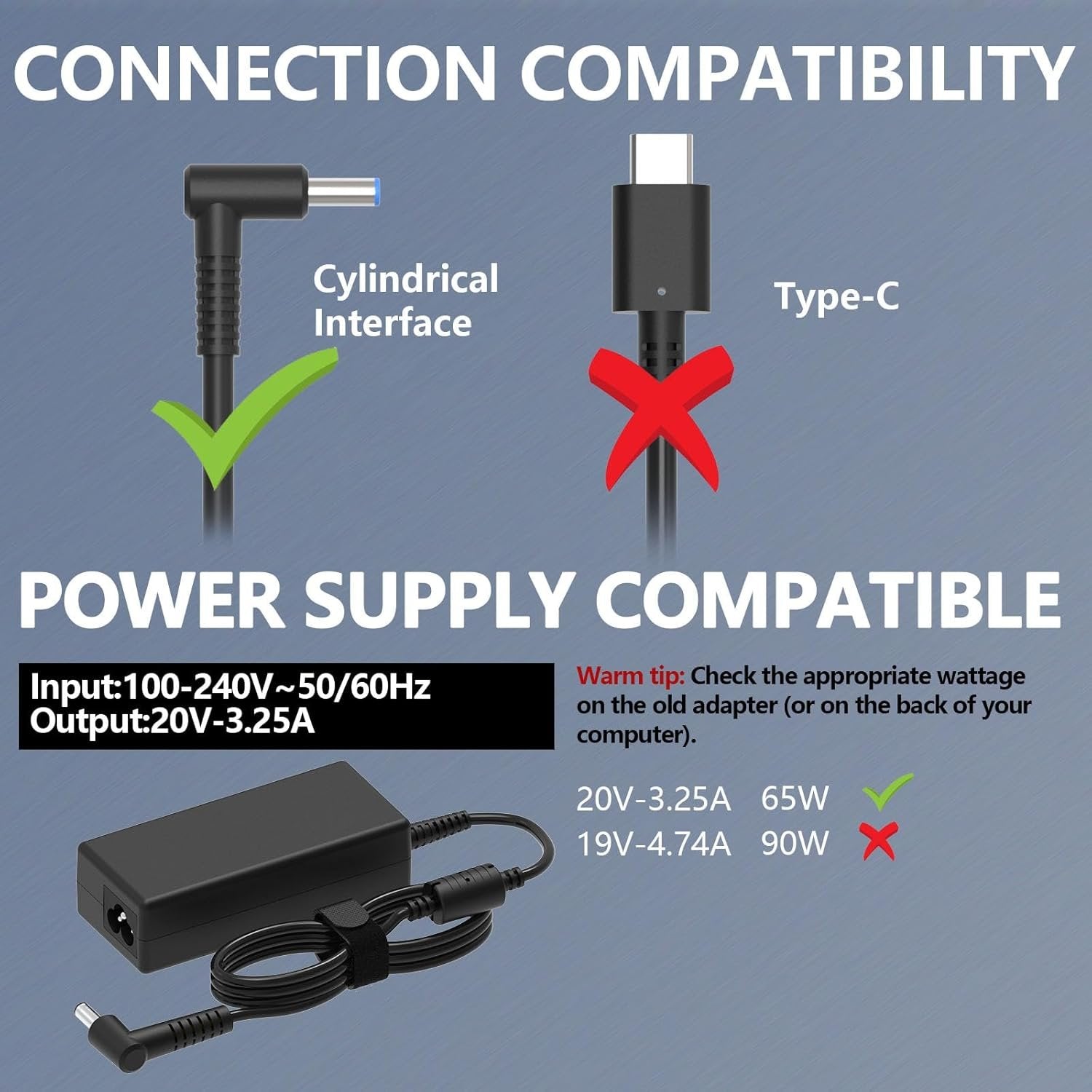 🔌【Specification】 Replacement Laptop adapter AC Input: 100-240V 50-60Hz; Output: DC19v 19.5v 20v, Max 65W. Replacement 45W chromebook charger. ⚠️ Please check the charging port size, this power adapter is not equipped with HP 7.4*5.0mm connector, 7.9*5.5mm connector/yellow rectangle connector and USB C port.Incompatible with Gateway laptop, 12 volt or 90W laptops ⚠️