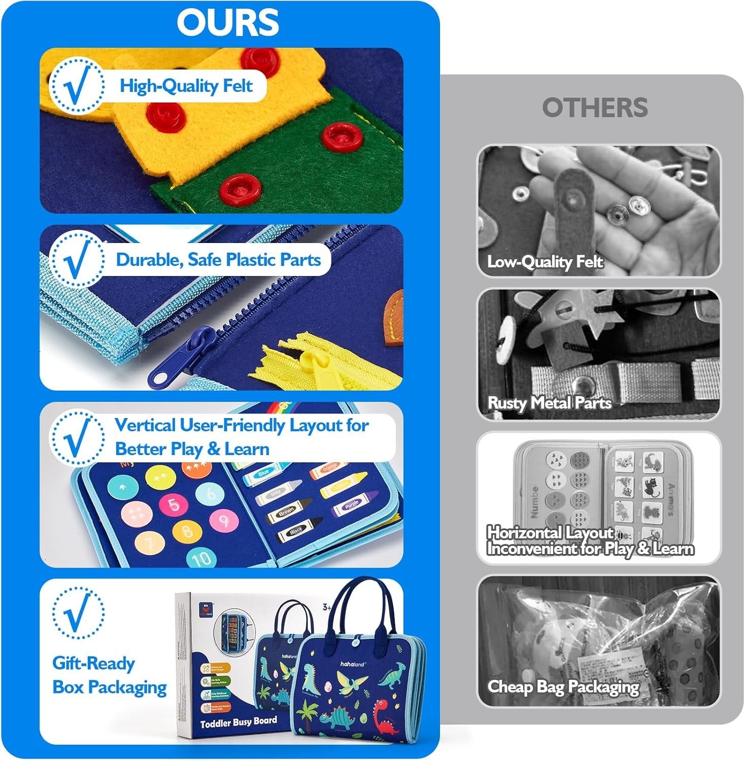 💯【7 in 1 Toddler Busy Board】A great busy board can keep your toddler entertained and learning for a while. Our Montessori board has 5 pages in 7 themes, life skills, alphabet, numbers, shapes, colours, animals and weather learning boards that your toddler will need to explore and play. ✨【Practice Basic Life Skills】The life skills board features 15 sensory activities, which can teach toddlers how to get dressed, buckle, snap, button, and tie. It works by Montessori inspiration, developing children's logical thinking and problem-solving skills. 💡【Improve Cognitive Development】The 6 cognitive boards includes 26 letters, 10 numbers, 10 colours, 12 shapes, 11 animals and 9 weather learning parts. All parts are attached with hooks and loops for toddlers to sort and match them to the board. It is a perfect educational toy to develop cognition. ✅【High-Quality Material & Exquisite Packing】We use excellent quality felt fabric that is soft to give your toddler a great experience. Each piece on the board is smooth and burr-free. Additionally, We have designed beautiful box packaging. It's an ideal gift choice for toddlers. 🏞️【Perfect Size & Portable Design】The 11×9 inches (28 x 23cm) size perfectly fits most diaper bags. Furthermore, there's a removable zipper design on cognitive boards, and it has a sturdy handle for easy carrying. It will be an excellent choice for travel activities and toddler toys.