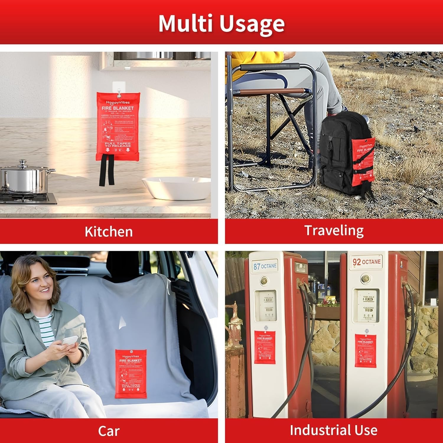 🔥 PREMIUM QUALITY: Kitchen fire blanket made of 0.4mm thick 100% fiberglass flame retardant fabric. It meets CE safety standards, featuring two layers of woven fiberglass and an inner fire-resistant film that can tolerate high temperatures up to 1076°F (580℃) 🔥 MUST HAVE SURVIVAL FIRE BLANKET KIT: 2-pack fire extinguishing blanket cuts off oxygen with no mess, unlike fire extinguishing spray. Keep these fire blankets in the home, kitchen, backyard, fireplace, grill, office, camping, or as part of your vehicle's survival kit for comprehensive protection 🔥 EASY TO USE: No formal training is needed just pull down through black strips on the fireproof blanket, spread the blanket to cover the fire completely, let the fire blanket fire suppression blanket suffocate the fire, and then turn off the heat source. It can also be used to cover the body for fire survival 🔥 MULTIPLE USE: Unlike traditional extinguishers, the fire blanket never expires. Fire blanket for home and kitchen has a wider range of applications. It is not only suitable for indoor small fires in homes, and kitchens but can also be used for outdoor camping, barbecues, travel, and other occasions 🔥 PEACE OF MIND: You will get 2 pack fire blankets to place into multiple locations. Keep the fire blanket extinguisher in the kitchen, backyard, or vehicle, or take it camping. It has a hole slot so it can also be easily hung on walls