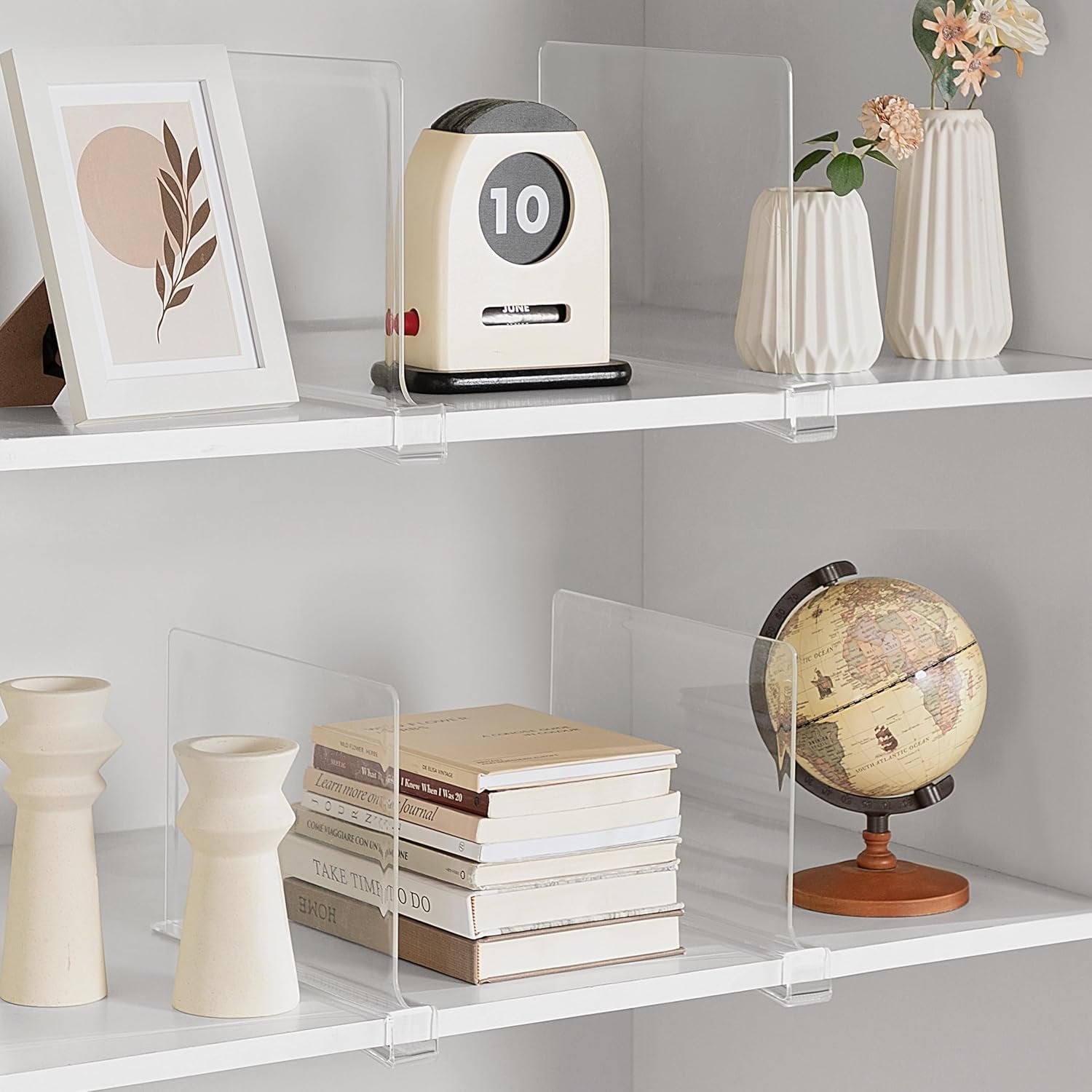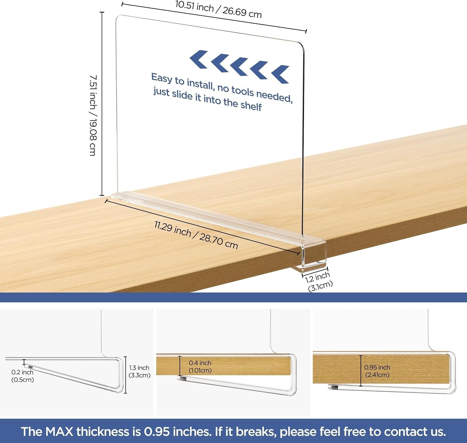 KEEP YOUR CLOSET ORGANIZED: Great way to separate clothes or purses, our shelf dividers can keep them in place. Definitely, it can free up more space to make your house look better. The fly in the ointment is that please don't mount it on a board longer than 0.95 inches, it will cause it to break. A CLEVER DESGIN: How wonderful these simple dividers,you can customize how big you want each “cubby” to be. Unlike metal wire closet shelf divider, designed with round and smooth corners, it will not scrape your shelves or clothes. EASY TO USE: Just slide them on the closet shelf and you are done, there are no tools assembly required. With a smart design and smooth surface of acrylic, they can easily be removed and readjusted whenever needed. EASY TO FIND ANYTHING NEEDED: Whether you have met the following cases- it was really hard to find anything that you needed quick while getting ready for work in the mornings, furthermore, too many clothes to find your sweaters, T-shirts, handbags and towels. Now, everything looks visible and easy to find, by our crystal-clear acrylic. PERFECT FOR VARIOUS SCENARIOS: As insertions for shelves, it can be used for closet organization, and can help plan the space in bookshelf and pantry. Because its the position of the adjustment are more flexible, they can even be used to organize photos and certificates.
