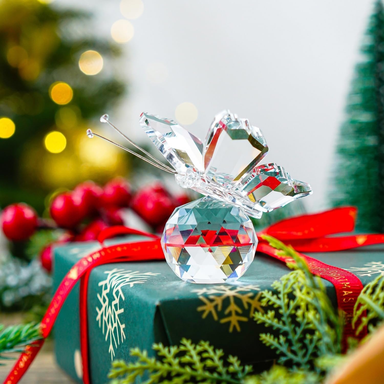 H&D HYALINE & DORA Crystal Flying Butterfly with Glass Ball Base Figurine Collection Ornament Statue Collectible Animal (Clear)