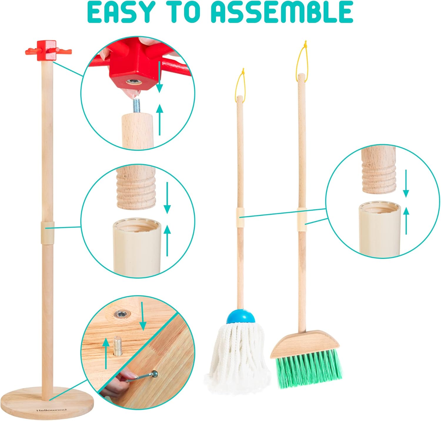 【Durable Wooden Cleaning Toys】This cleaning kit is made of real natural solid beech wood, sturdy enough to outlast the common kids broom mop sets that made of plastic, particle board or inferior pine. 【Realistic Toddler Cleaning Set】These kids cleaning tools really work for housekeeping. Designed with longer broom & mop handles and tilted broom handle, the upgraded kids broom set is better tailored for kids age 3-6. 【Inspire Hours of Pretend Play】This toddlers cleaning pretend play set is designed to motivate your child to model independence and use their imagination to have fun, each cleaning tool gives them an imagined role and pretend task to try. 【Develop Good Habits】Learning by imitation, toddlers will build good habits of keeping the room tidy and organized through participation in housekeeping. This skill-building and confidence-boosting set is designed to strengthen and embolden your child's sense of purpose. 【What You Get】Buy now you get the 8-piece cleaning set includes: Wooden Broom*1, Mop*1, Duster*1, Dustpan*1, Brush*2, Rag*1, Organizing Stand*1, Screw*1, Hexagon Wrench*1, and timely friendly customer service. Note: Our "HELLOWOOD" label only authorizes "Hellowood-AU" stores. We are not responsible for the quality of other suppliers' products. Please buy carefully.