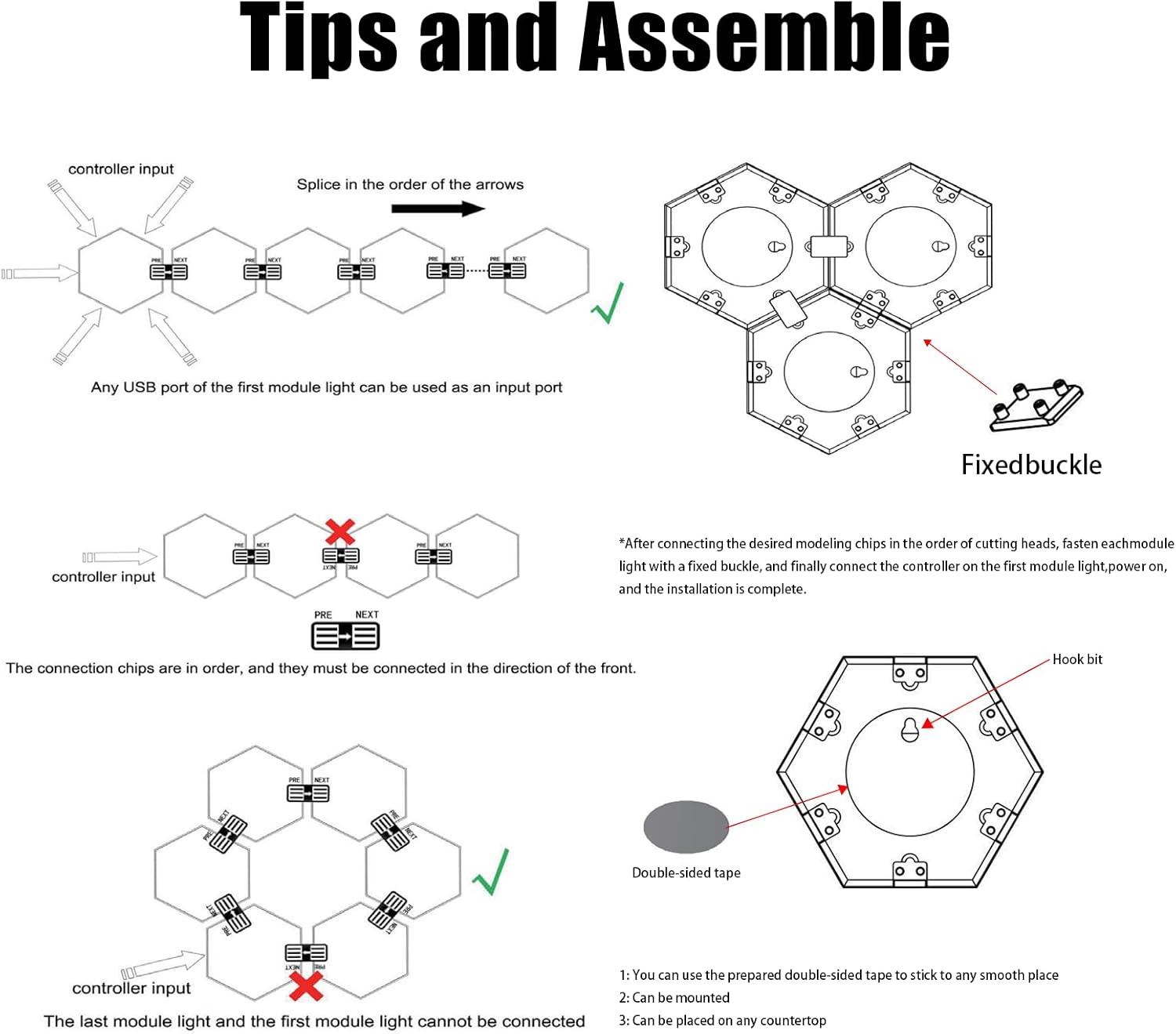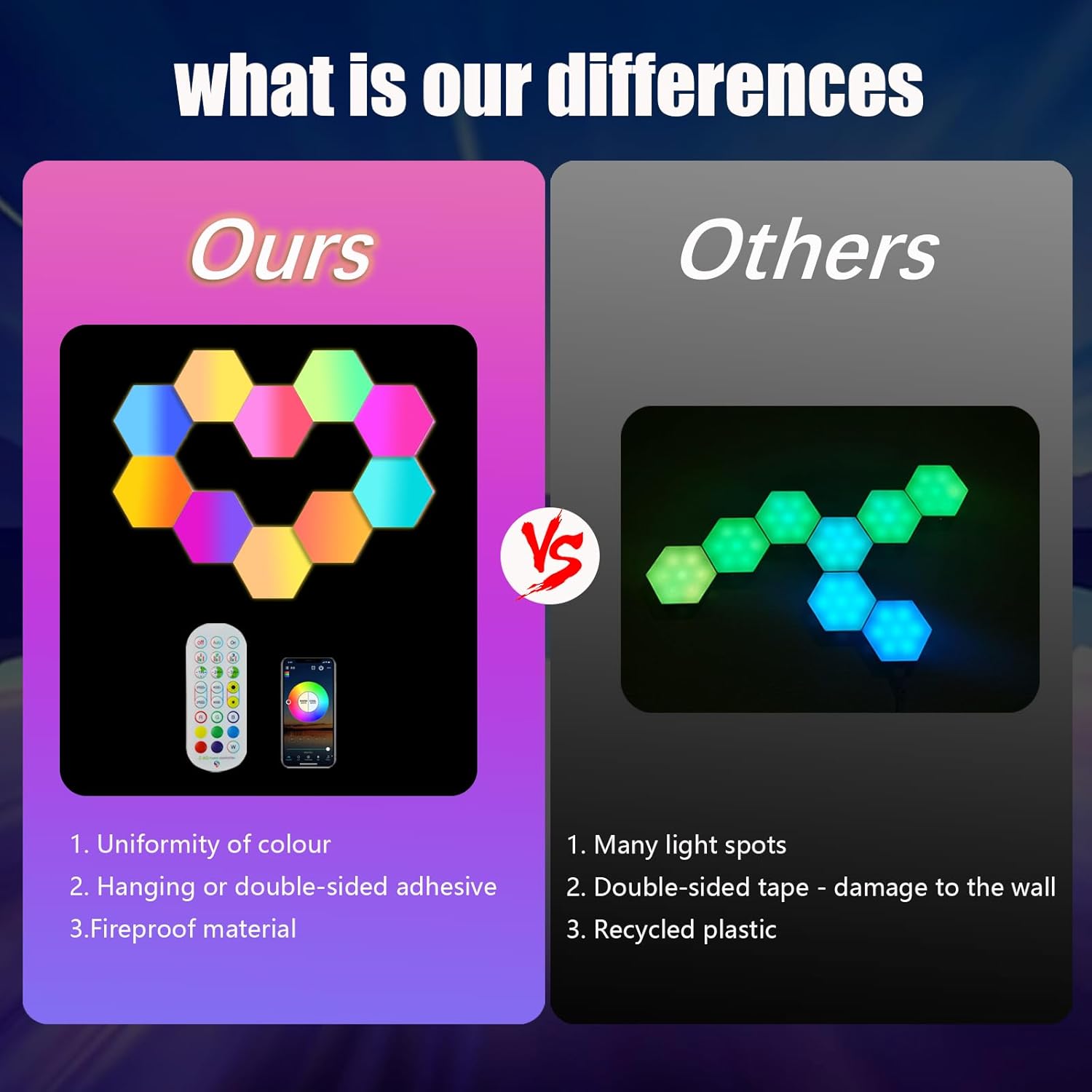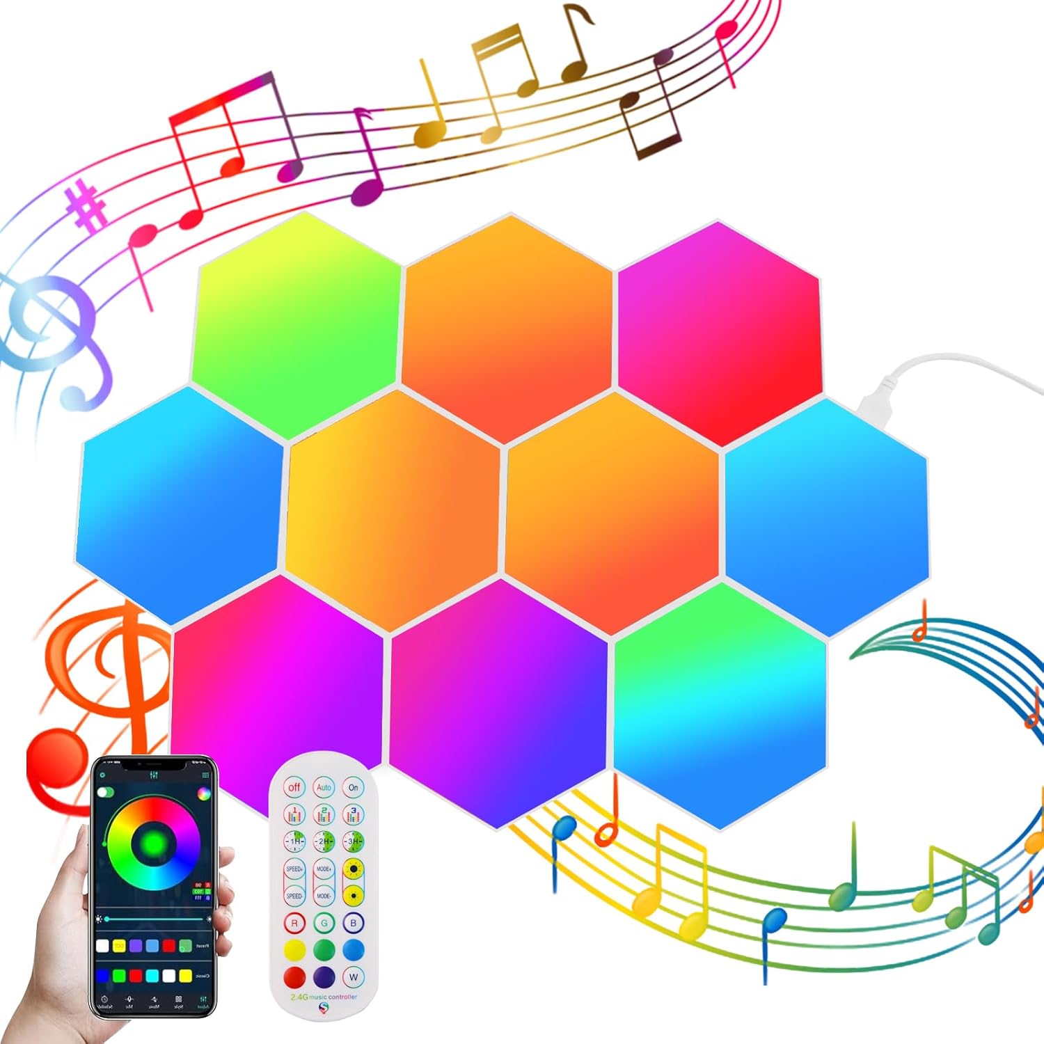 Multiple Installation Methods: There are screw holes on the back of the lamp that can be drilled and hung on the wall. You can also use the double-sided adhesive tape included in the package to fix the lamp to the wall. Please note that drywall, wallpaper or rough or uneven walls, such as brick walls, concrete walls or textured walls, it is not recommended to use double-sided tape. Celebrate Audiovisual - With over 8 music sync modes, each LED panel dances to the beat and unleash your passion for sound and light. Turn your songs, videos or games into a fun light show and spend a wonderful time at home parties and home theater. Final control: The hexagonal lamp can be controlled in three ways: via application, wired control and remote control. The app allows you to unlock more functions, such as on and off, color change, brightness adjustment, speed control, time settings, music synchronization and selection of over 16 million colors and over 200 modes to decorate your home. GREAT GIFT IDEA The hexagon lamp set includes 10 pieces hexagonal wall light panels, ribbon, USB control cable (no plug), snap, connecting chip, remote control and user manual, screws. With a 12-month warranty and online support, we offer you 100% high quality products and services. LED lights are the perfect room decoration gift for friends and family.