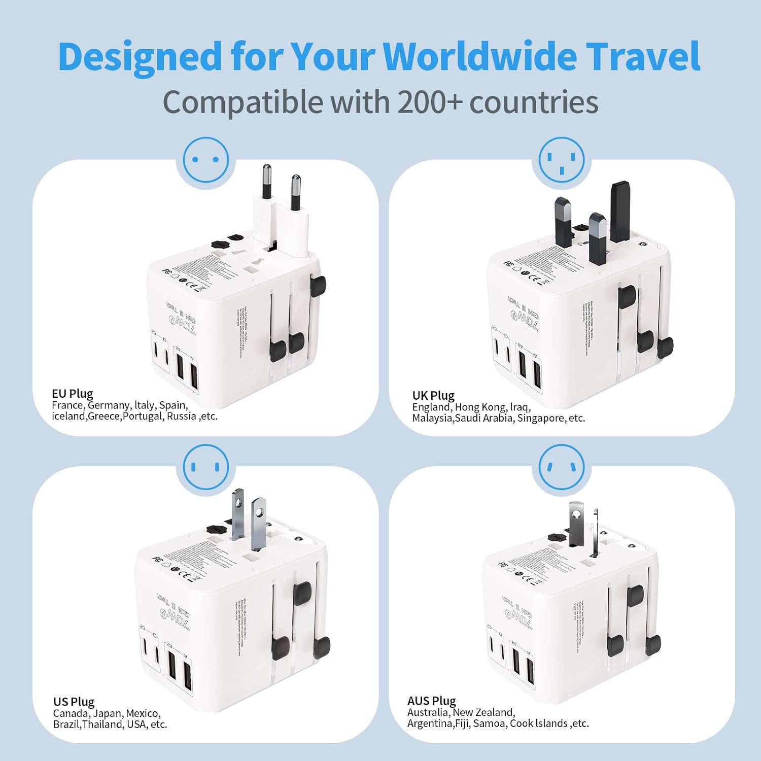 (2 USB C Ports & 2 USB A Ports): The USB Type-C charging port ensures fast charging speed. Adapter compatible with almost all USB devices such as Apple IPone 15/16/pro/promax, Samsung and other Android phones, ipads, smart watches, earphones, tablets, power bank, camera, game console and so on (Universal Adapter):This travel adapter accepts plugs from over 200 countries with US/EU/UK/AU European plugs such as Thailand, New Zealand, Israel, Italy, Rome, France, Spain, Canada, China, Australia, India, Hong Kong, Argentina, Peru, Korea, Asia, etc (Safety Protection): As a universal power adapter, it consists of a robust polycarbonate shell with a thermal protection layer. This USA to UK adapter has a built-in dual 10A fuse and safety shutter design to ensure you and your equipment are fully protected (Converter without voltage): Rated voltage of 10A max. 100-250Vac (1000W max. 100Vac 2500W max. at 250Vac). This charger adapter plug only converts the power outlet, not the output current and voltage (Compact and Lightweight): This compact and lightweight international power adapter is perfect for travelers, with compact size of 2.71 * 1.96 * 2.15 inches, it can easily fit in your suitcase or take on a cruise ship. An essential product for globetrotters, business abroad, work and students