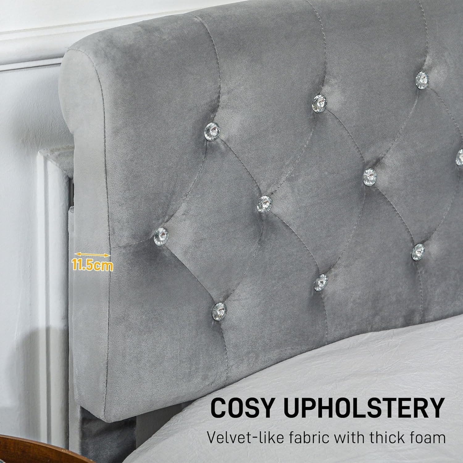 Elegant and Cosy: This full size bed frame features a luxurious headboard with crystal decoration and a vintage-style elevated footboard, enhancing any bedroom decor. Upholstered in soft, velvet-like fabric with thick foam, this full bed frame with headboard offers both of comfort and elegance. Extra Storage: Equipped with two large drawers, this full size bed frame with storage provides hidden space for storing off-season clothing or bed linens, featuring smooth-rolling wheels for easy access. Reliable Support: The bed base combines steel legs and eucalyptus wood slats, supporting up to 550 lbs (250 kg), which helps prevent sagging and extends mattress's life. Simplified Setup: Wood slats are pre-connected by hook and loop fastener strips to ensure easy installation and reduce shifting and noise during subsequent use. Assembly tools and straightforward instructions included make setting up this bed frame simple. Bed Frame Information: Overall Dimension: 56.1" W x 80.9" D x 38.6" H (142.5 x 205.5 x 98 cm). Drawer Size: 28.7" W x 18.5" D x 4.7" H (73 x 47 x 12 cm).