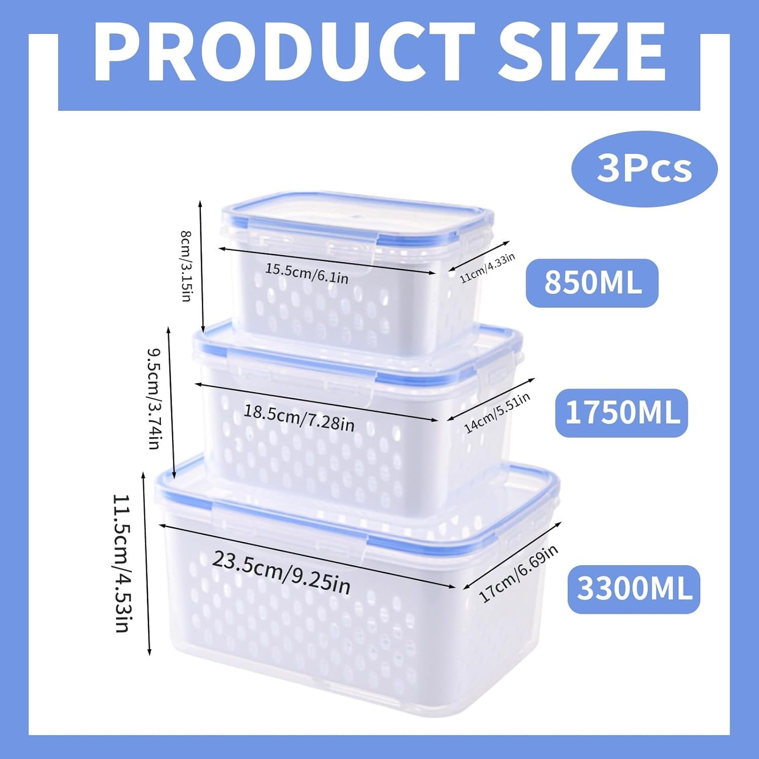3Pcs Fruit Storage Containers for Fridge with Removable Colanders,Fruit Storage Containers with Draining Basket – Set of 3 Sizes (580ml + 1750ml + 3300ml) Specifications of Fruit Storage Containers: - Quantity: 3x Food Storage Containers with Lid - Material:PP+Silicone - capacity:580ml + 1750ml + 3300ml - Color:transparent Features of Fruit Storage Containers: Perfect for a Variety of Foods This set of 3 fruit storage containers comes in three convenient sizes (580ml, 1750ml, 3300ml), making them ideal for storing a wide range of items. Perfect for fruits, vegetables, berries, meats, and more. These containers ensure your food stays organized and fresh for longer, with ample space to suit different portions and types of produce. Enhanced Freshness with Tight Seals Featuring a silicone sealing ring, these containers provide a seamless fit to keep your food fresh. The airtight design, secured by locking clips on all four sides, locks in the flavor and prevents moisture and air from entering, extending the freshness of your ingredients. Innovative Draining Basket for Cleaning and Storing The built-in draining basket allows you to rinse your fruits, vegetables, or meat right inside the container. The design ensures water flows out efficiently, leaving your food clean and dry. After washing, the excess water drains to the bottom of the container, maintaining optimal storage conditions and prolonging freshness. Organize Your Refrigerator with Ease Say goodbye to clutter and disorganization in your fridge! With these food storage containers, your fridge will stay neat and tidy. Easily categorize and access your ingredients, while preventing cross-contamination of flavors. No more searching for what you need or dealing with spills! Durable, Safe, and Versatile Made from high-quality, BPA-free PP material, these containers are durable, odor-free, and resistant to deformation. They can withstand both hot and cold temperatures, making them safe for refrigerator storage. The leak-proof design and sturdy construction ensure long-lasting use in your kitchen.