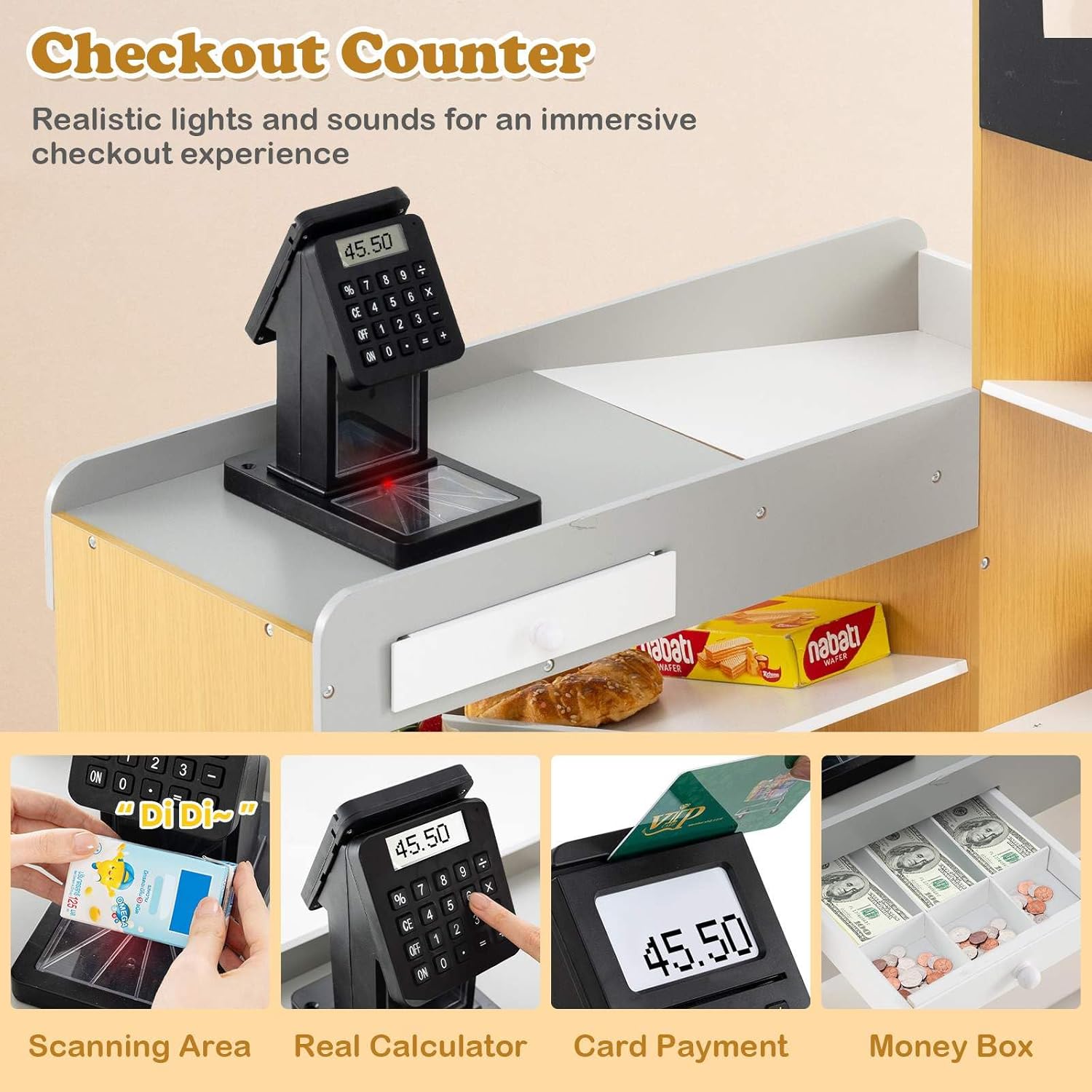 Interactive Checkout Counter: The checkout counter is equipped with a cash register, money box, and VIP card. With authentic lights and sounds, the cash register features a real calculator, scanning area, and card payment option, offering kids an immersive checkout experience. Spacious & Classified Storage: Including multiple open shelves and an enclosed cabinet, this pretend play grocery store is perfect for storing play essentials and teaching kids about organization. Moreover, some of the open shelves have anti-falling baffles for added security. Safe & Reliable Construction: Designed with safety in mind, this toddler grocery store set boasts a splinter-free surface and rounded edges. It complies with EN71 and CPSIA standards, ensuring premium quality and reliability for active play. Designed for Convenient Use: The shopping cart is designed with smooth wheels and an easy-to-grip handle to facilitate simple navigation, with a large capacity to store shopping items. Additionally, the convenient handle makes it easy to open the door and fetch needed objects. Brilliant Gift for Little Ones: This wooden supermarket playset is a fantastic choice for children aged 3+ years old. Not only does it provide entertainment, but it also helps nurture arithmetic skills, intelligence, logical thinking, and social interaction. It is an exceptional gift for special occasions.