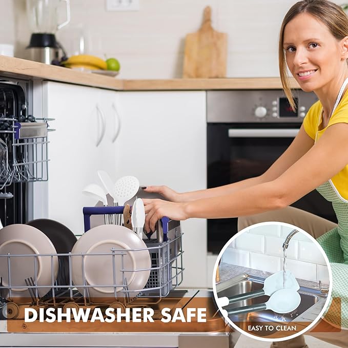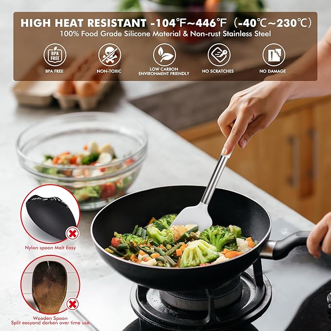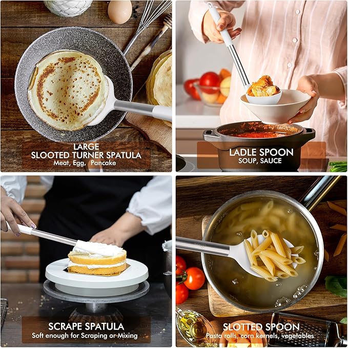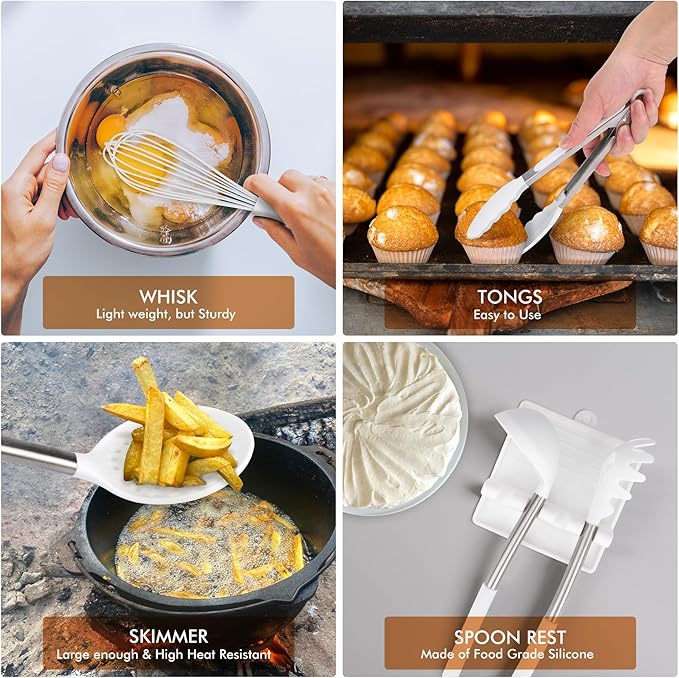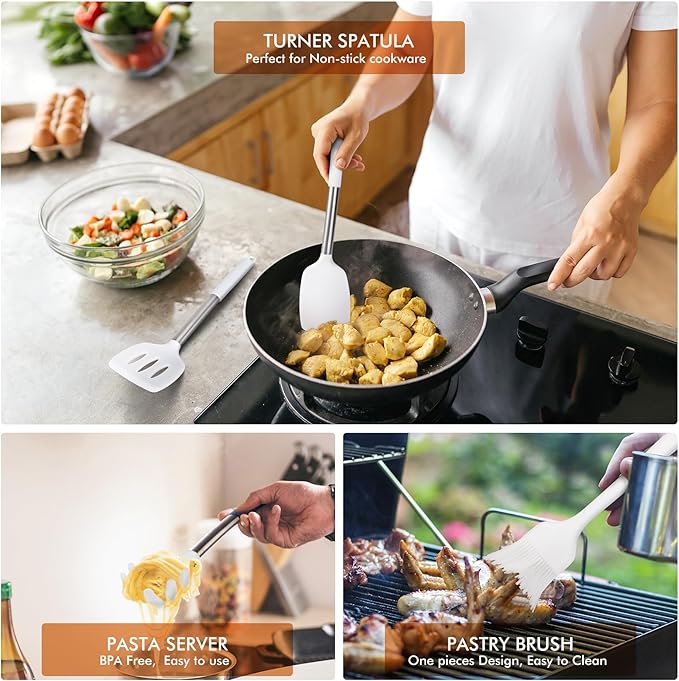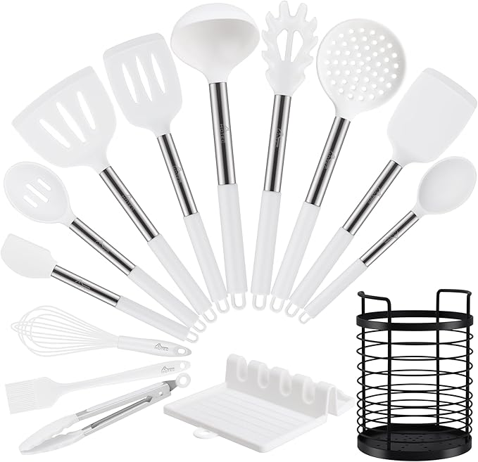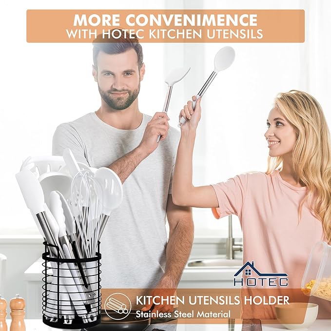 HOTEC Heat Resistant Silicone Kitchen Utensils, Cooking Utensil Set, Spatula Set, BPA Free, Kitchen Gadgets, Utensils Holder, Dishwasher Safe, 14pcs White