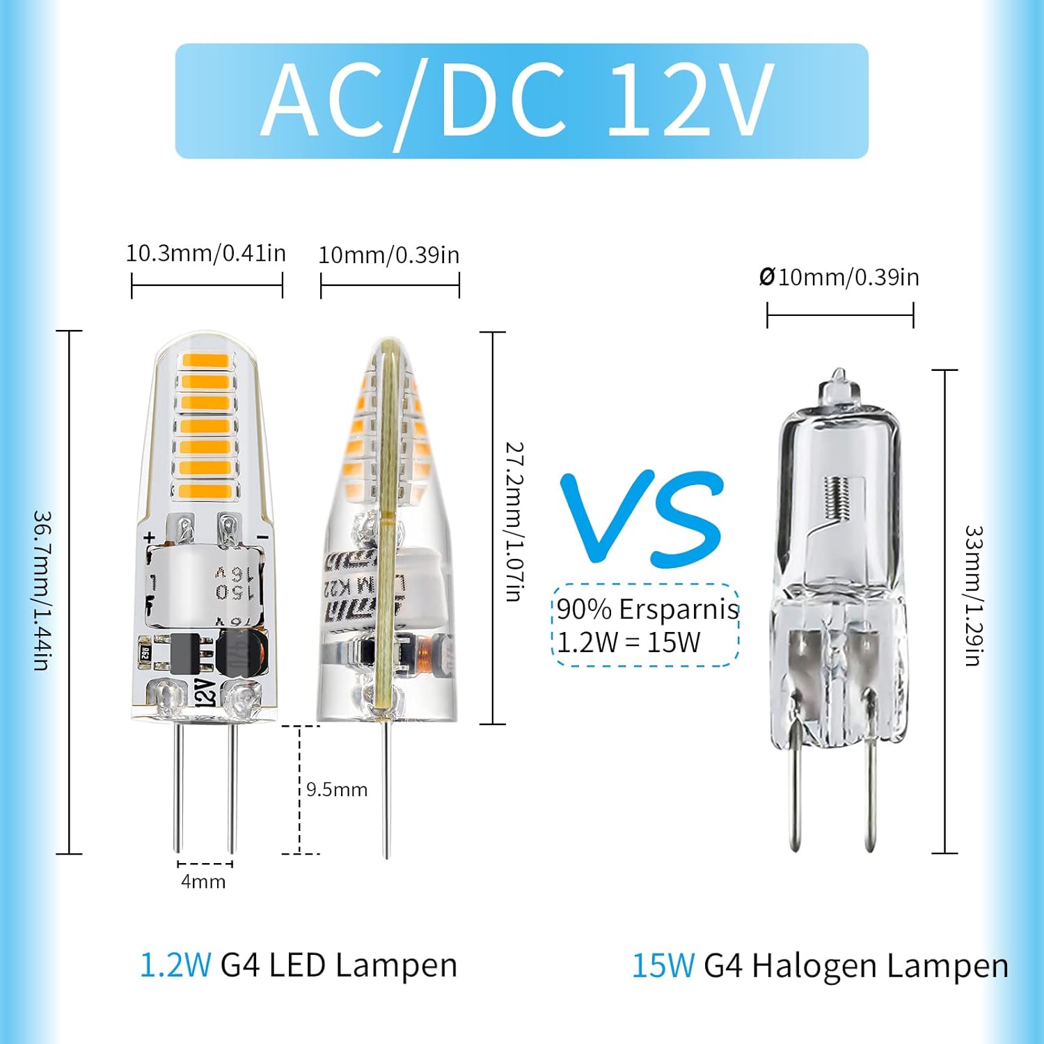 90% Energy Saving: G4 LED AC/DC 12V 1.2W Bulbs Replace 15W Halogen Bulbs, 110LM LED Bulbs can be brought to full brightness instantly, 90% on electricity bill. Long-lasting quality: G4 LED bulbs are of good quality, repeatedly tested by our factory. They are completely silent in operation, no flicker, the light transmission is very good and last longer than halogen ones. Eye protection and no flickering: 3000K warm white creates a warm and comfortable atmosphere, the light is warm, ideal for bedroom, bathroom, living room, etc, stable light output and no flicker, protect your eyes. Long-lasting: Certified by CE, RoHS, the material has good heat dissipation, high safety, non-dimmable, outstanding service life up to 30,000 hours. 🔥【Easy Installation】: Size 10.3mmx36.7mm, its size is a little larger than the average halogen lamp, please confirm whether the lamp size is suitable before purchasing.